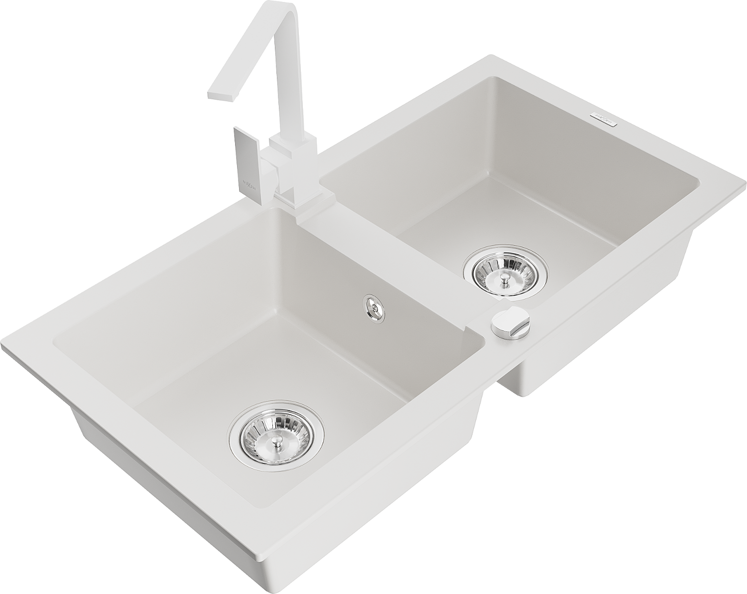 Mexen Mario dvojkomorový granitový drez s kuchynskou batériou Rita, biely - 6504-20-670300-20