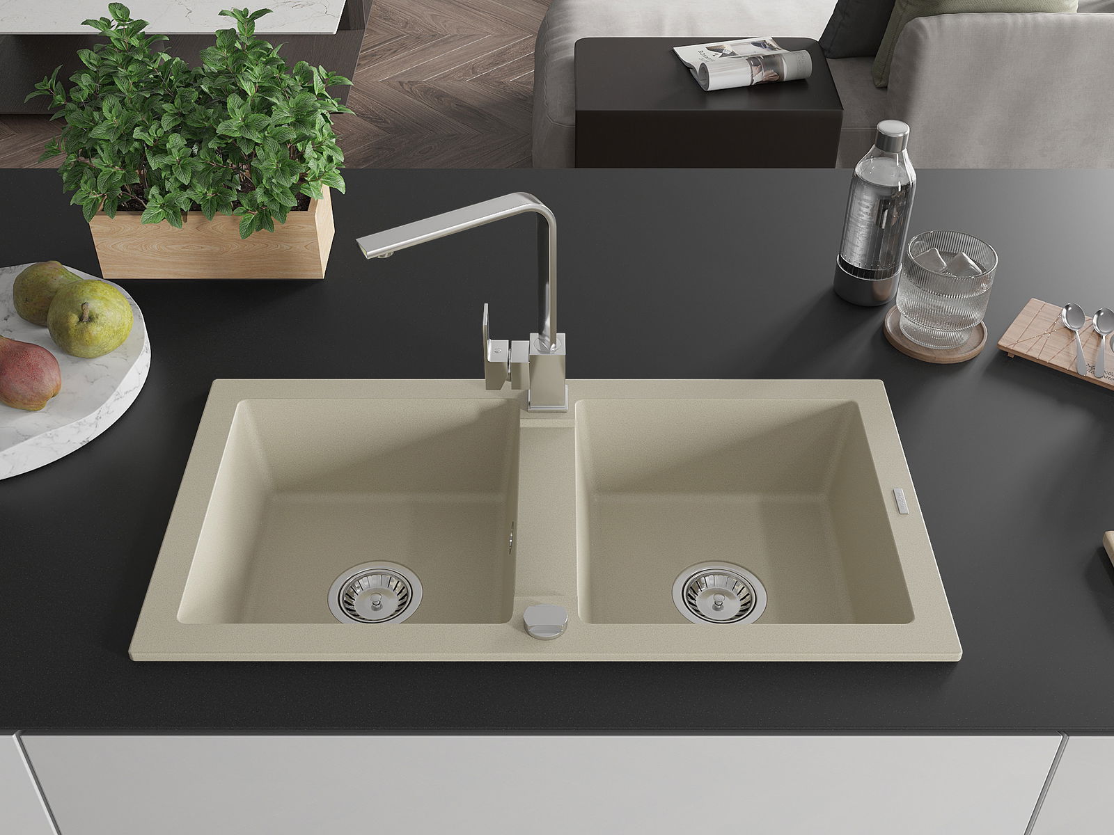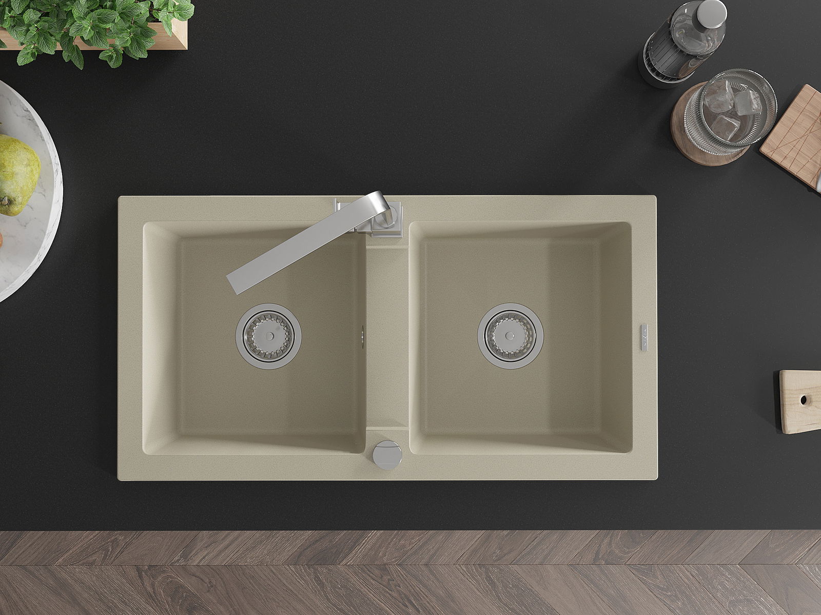 Povrch kuchynského drezu je odolný voči škvrnám a zafarbeniu, vďaka čomu sa ľahko udržiava a zachováva svoju farbu počas dlhého obdobia používania. Estetický a praktický doplnok pre každú kuchyňu.