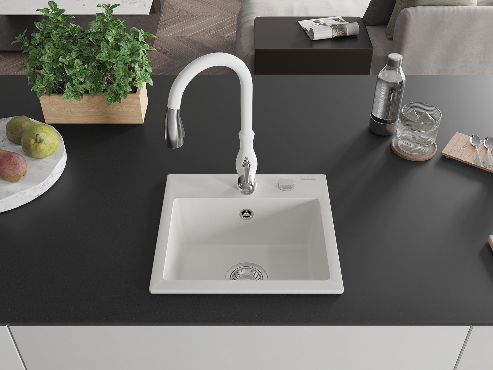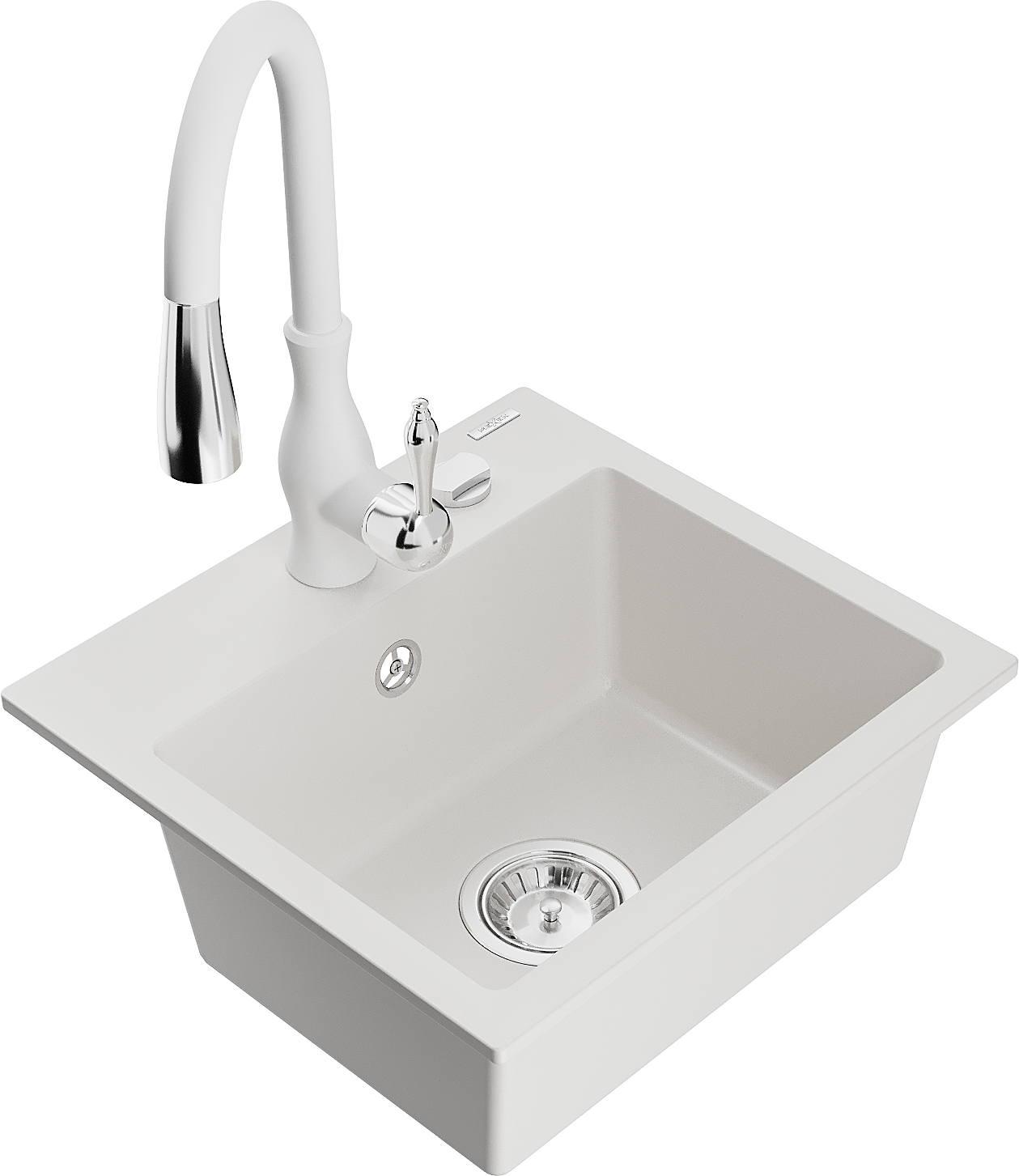 Mexen Milo kuchynský drez z granitu s 1 komorou s kuchynskou batériou Savita, biela - 6505-20-672601-20