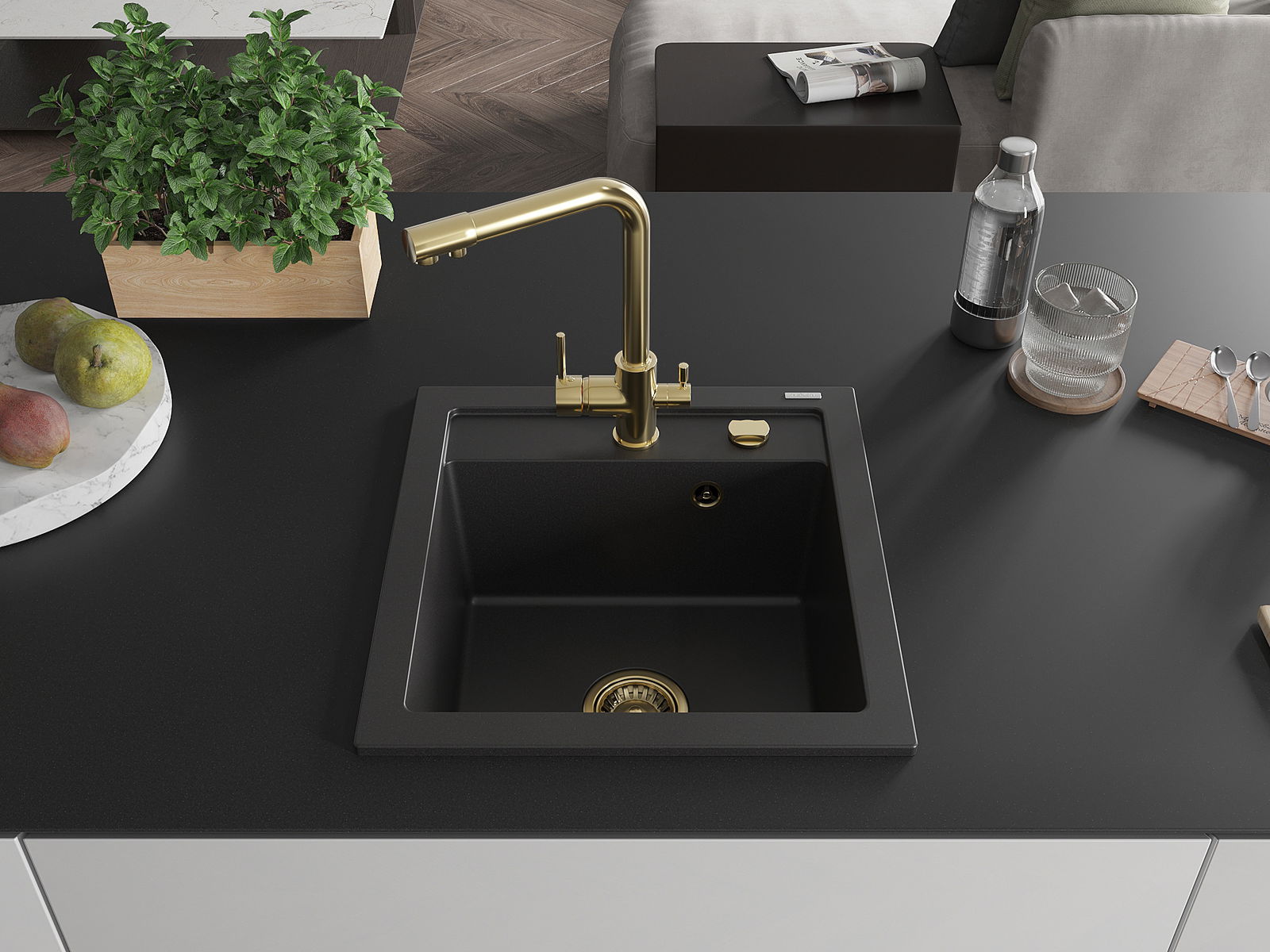 Drez má predfrézovaný otvor s priemerom 35 mm na samostatné prerazenie. Môže sa využiť napríklad na montáž dávkovača na tekutinu, ktorý eliminuje prítomnosť plastových fliaš v kuchyni a pridáva jej elegantné dokončenie.