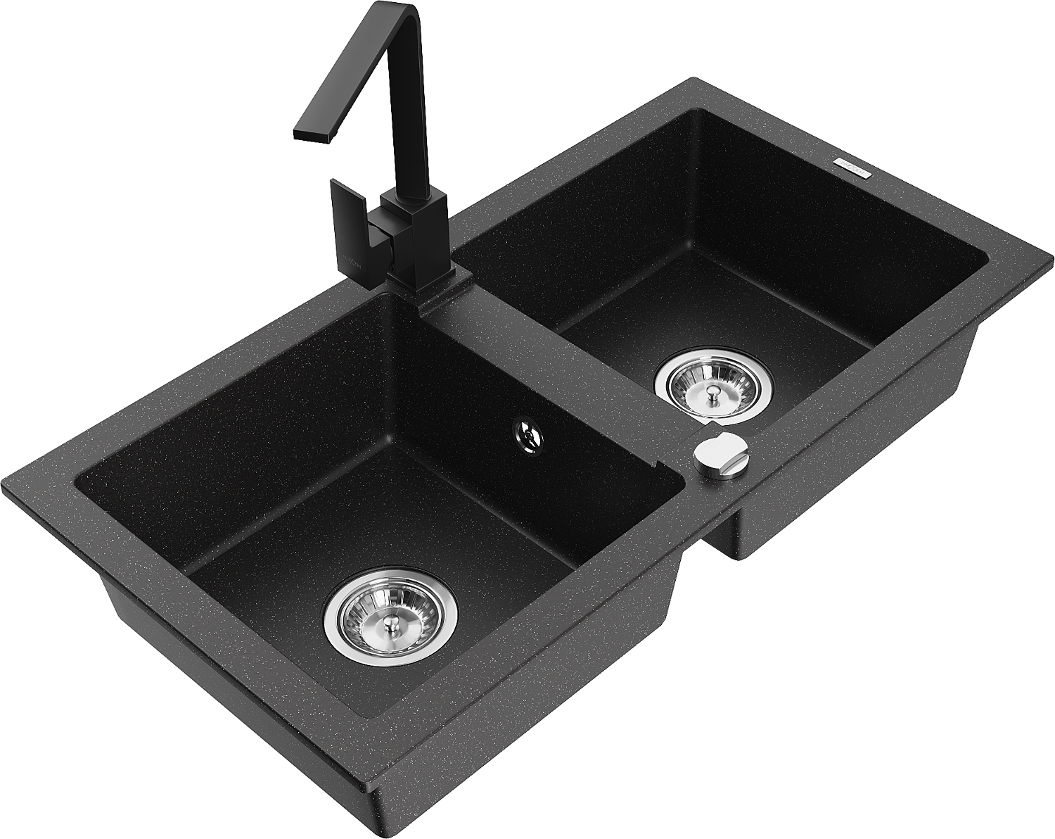 Mexen Mario dvojkomorový granitový drez s kuchynskou batériou Rita, čierny/strieborný metalik - 6504-73-670300-70