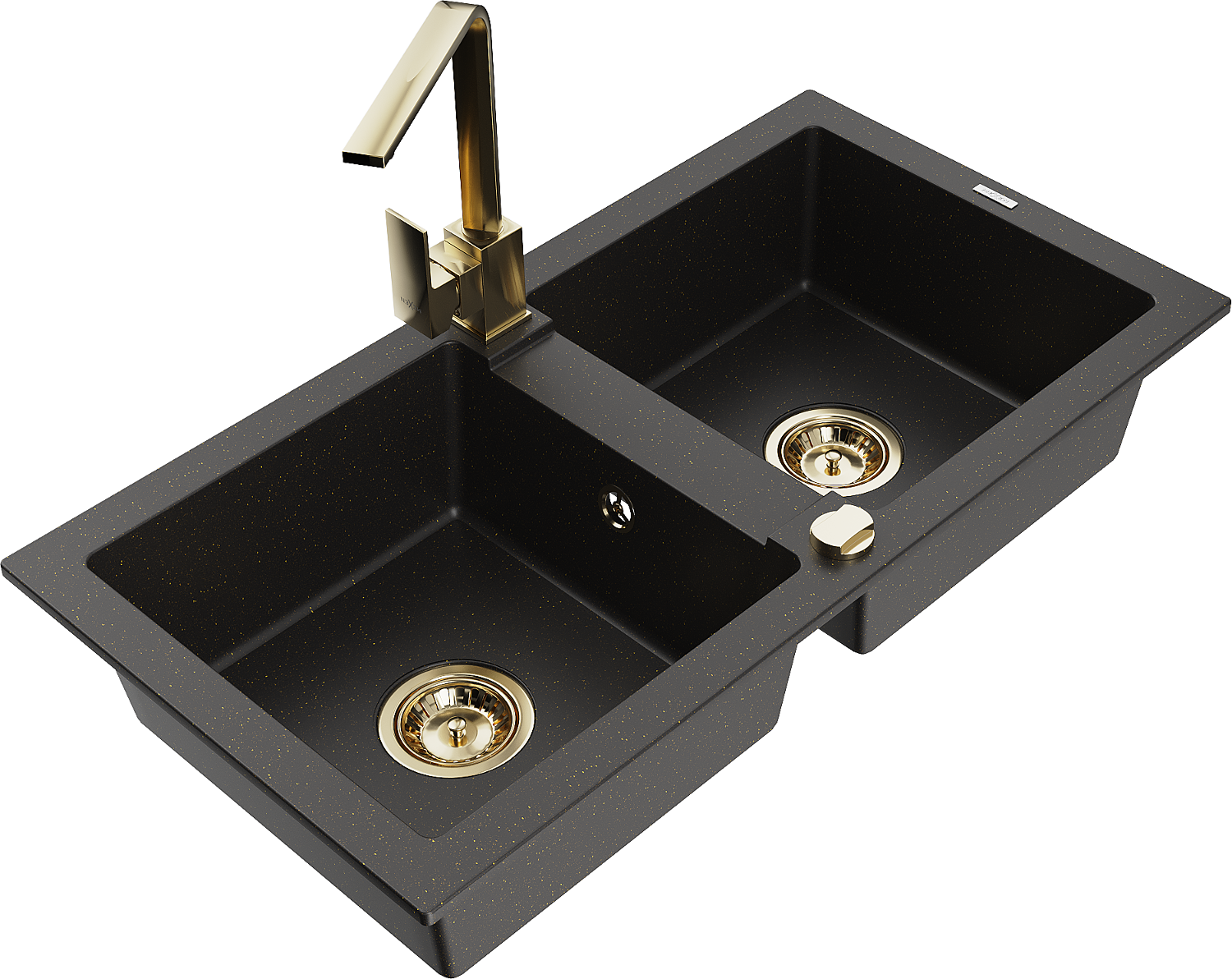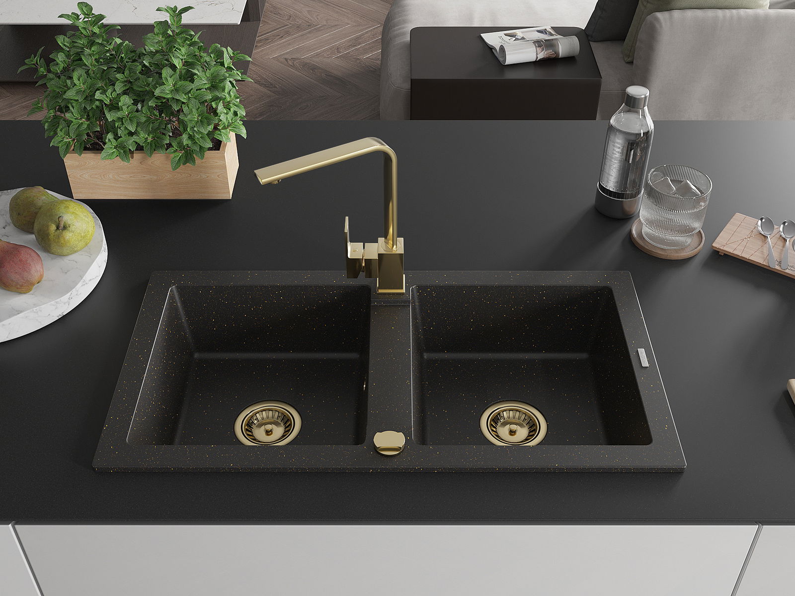 Mexen Mario dvojkomorový granitový drez s kuchynskou batériou Rita, čierny/zlatý metalický - 6504-75-670300-50