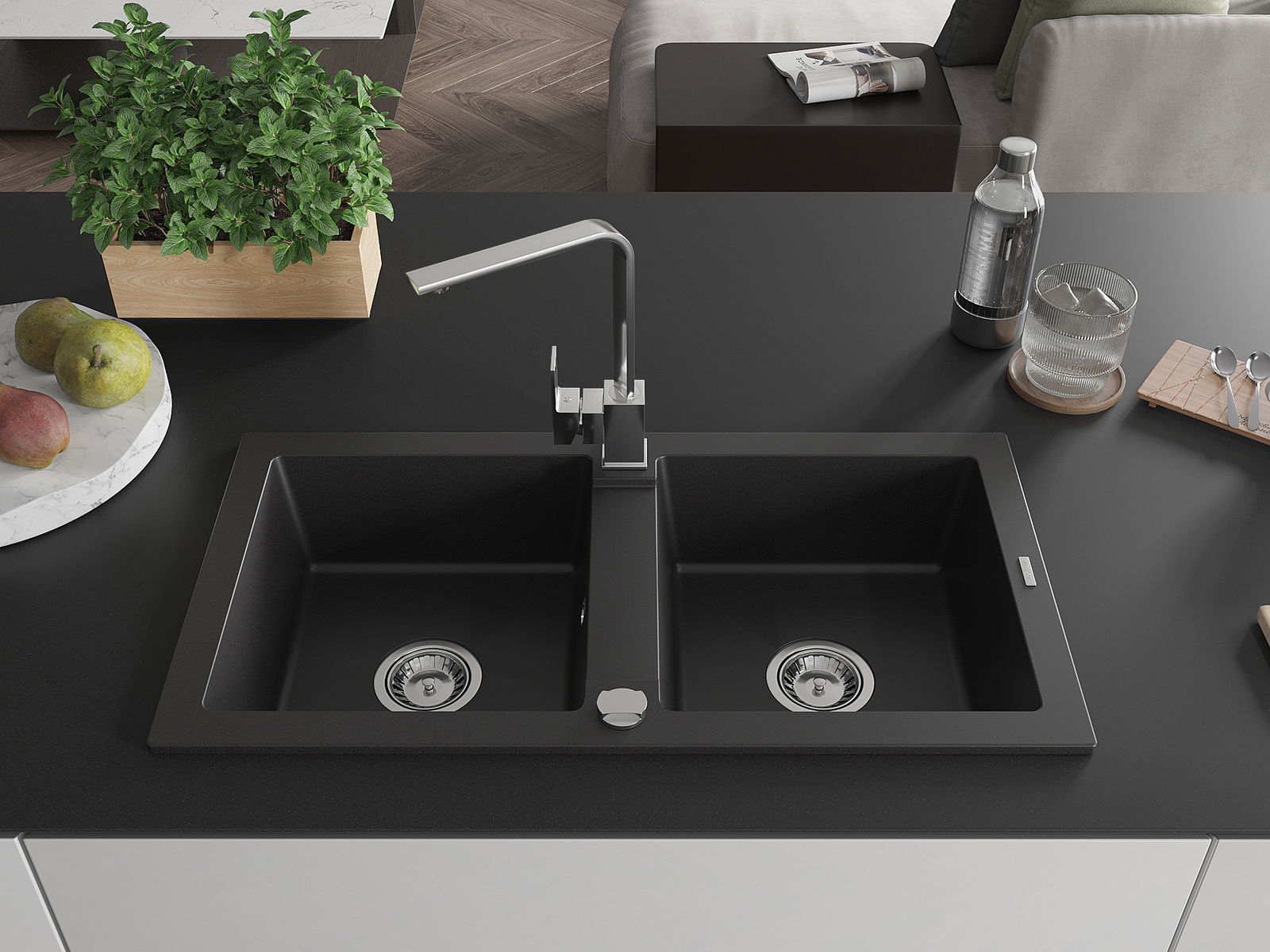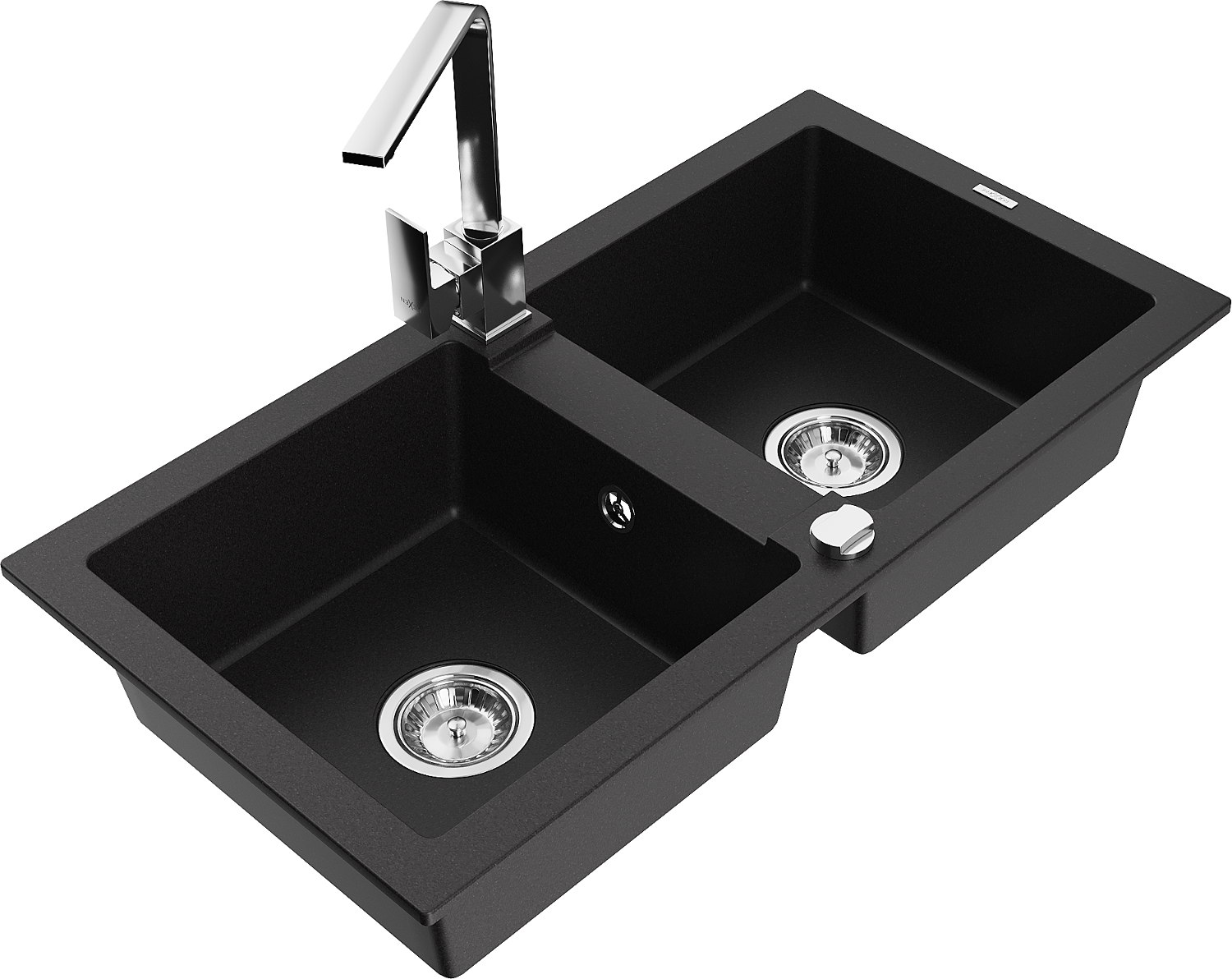 Mexen Mario žulový dvojkomorový kuchynský drez s kuchynskou batériou Rita, čierny - 6504-77-670300-00