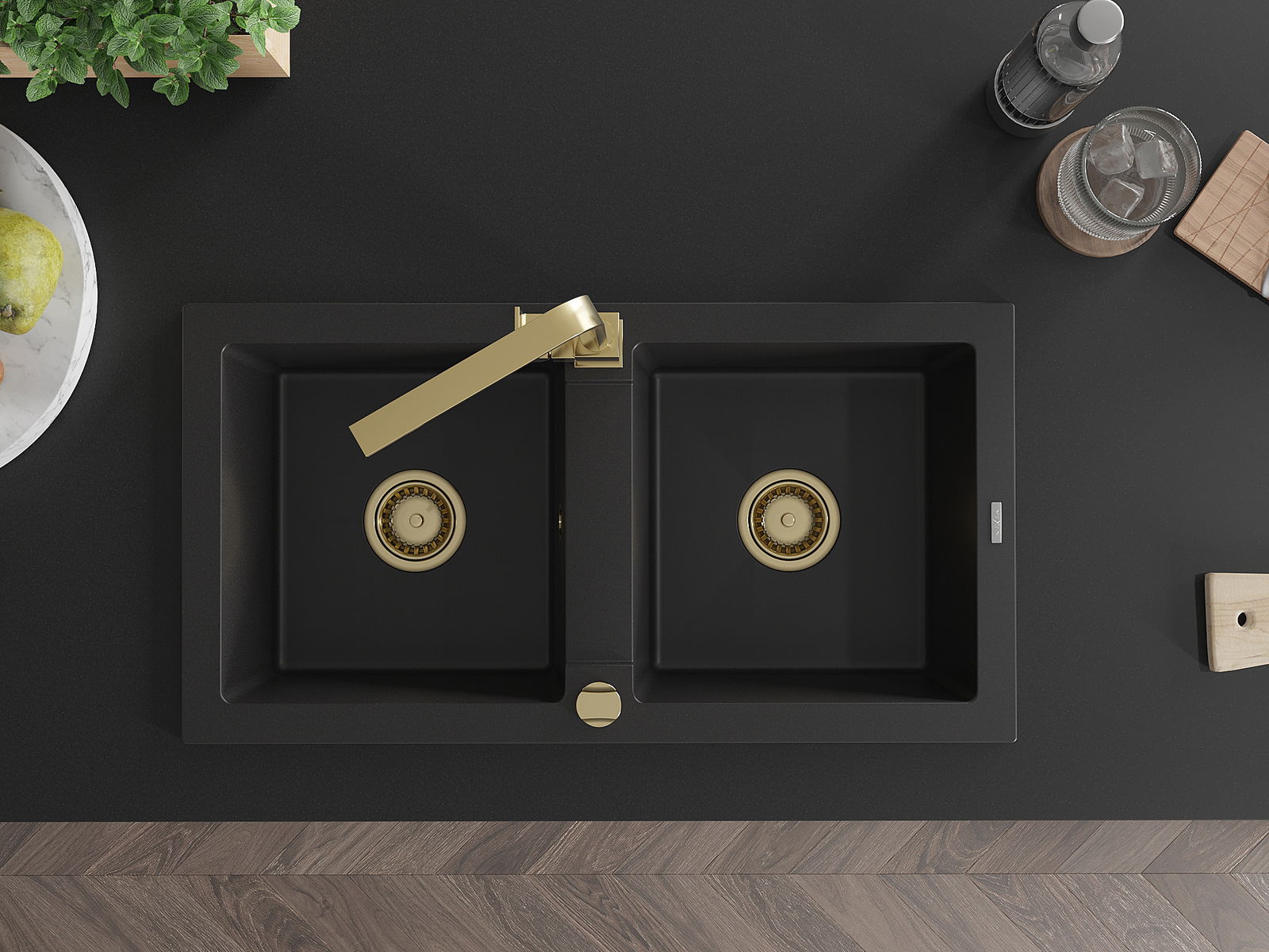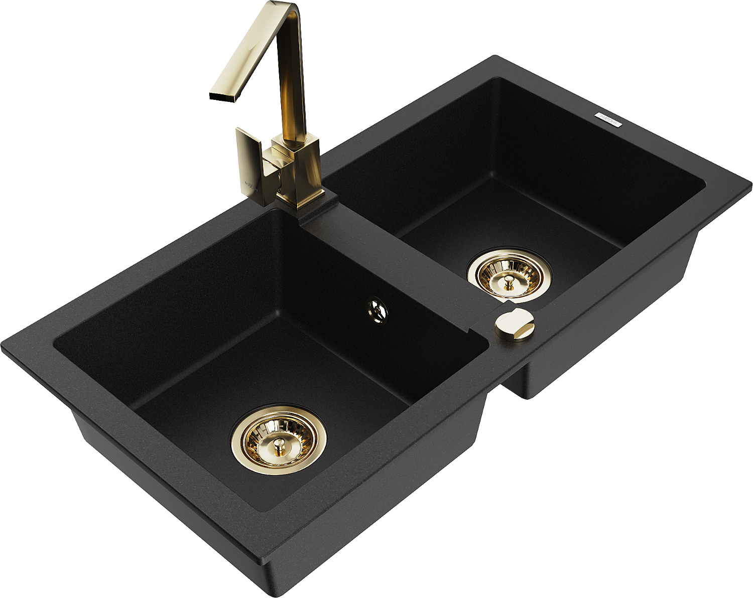 Mexen Mario dvojkomorový žulový drez s kuchynskou batériou Rita, čierny - 6504-77-670300-50