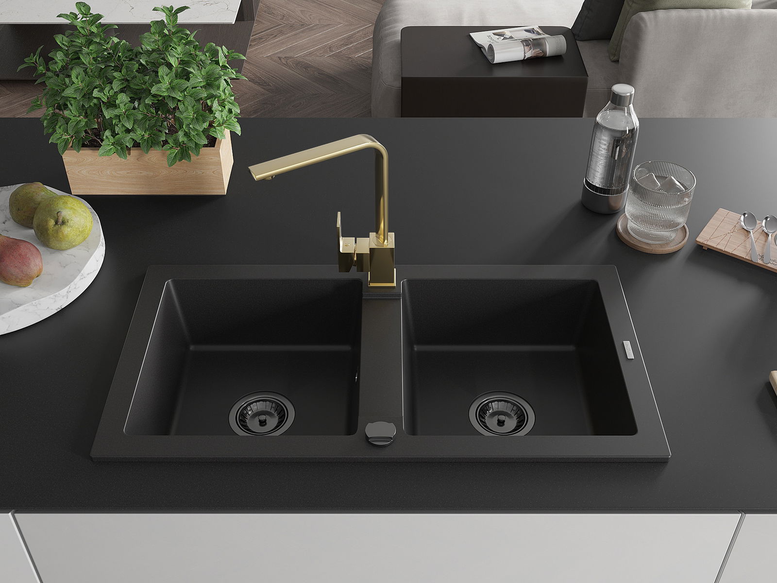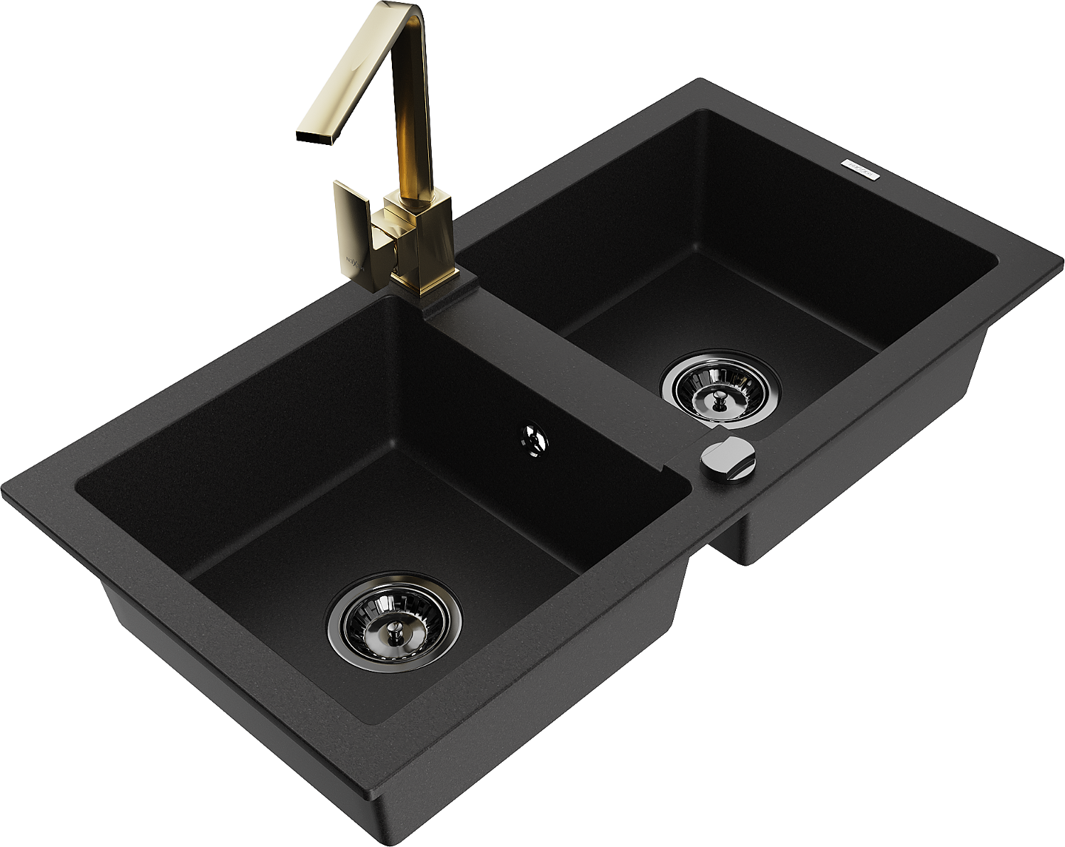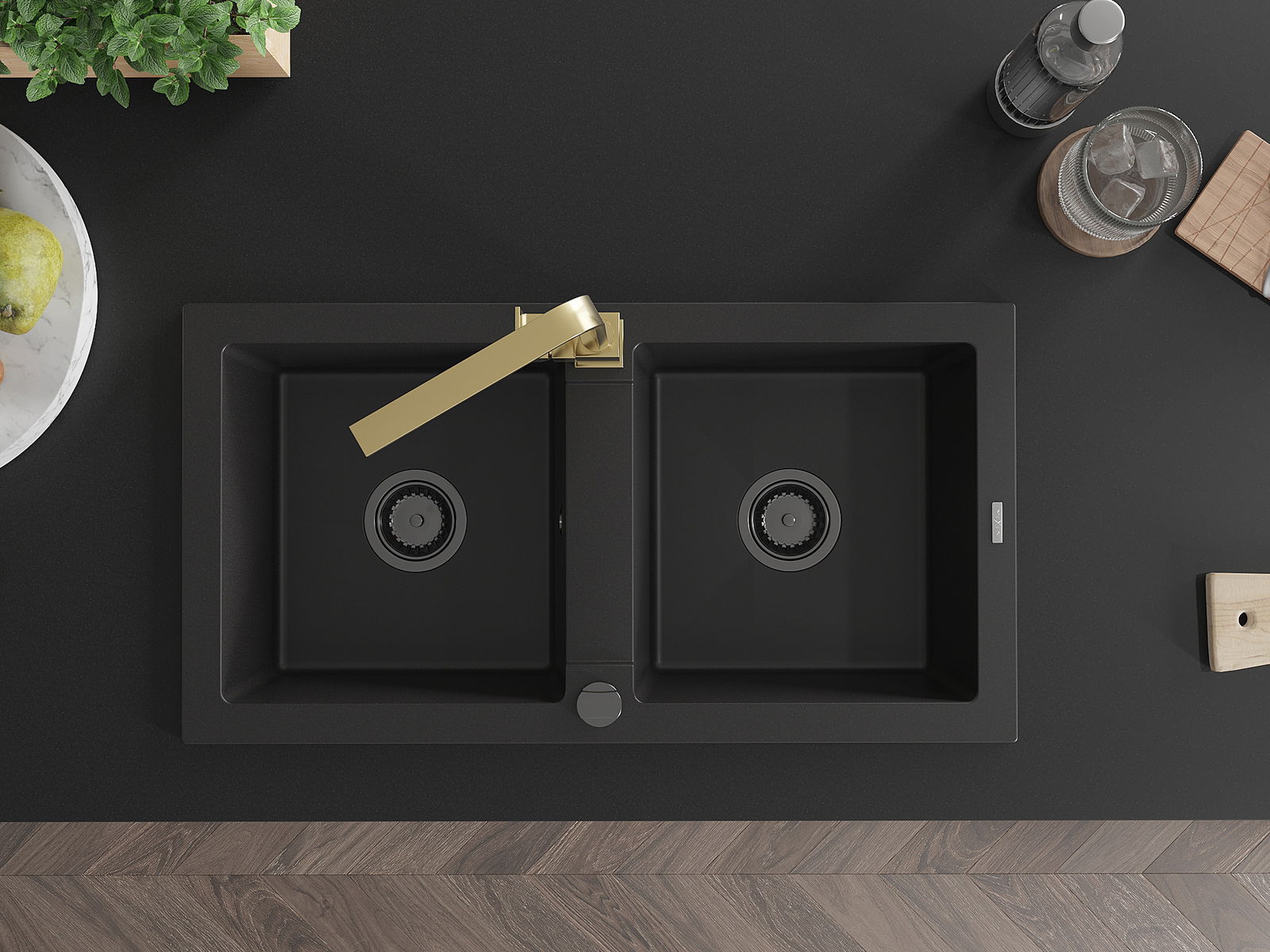 Mexen Mario dvokomorový žulový drez s kuchynskou batériou Rita, čierny - 6504-77-670300-50-B