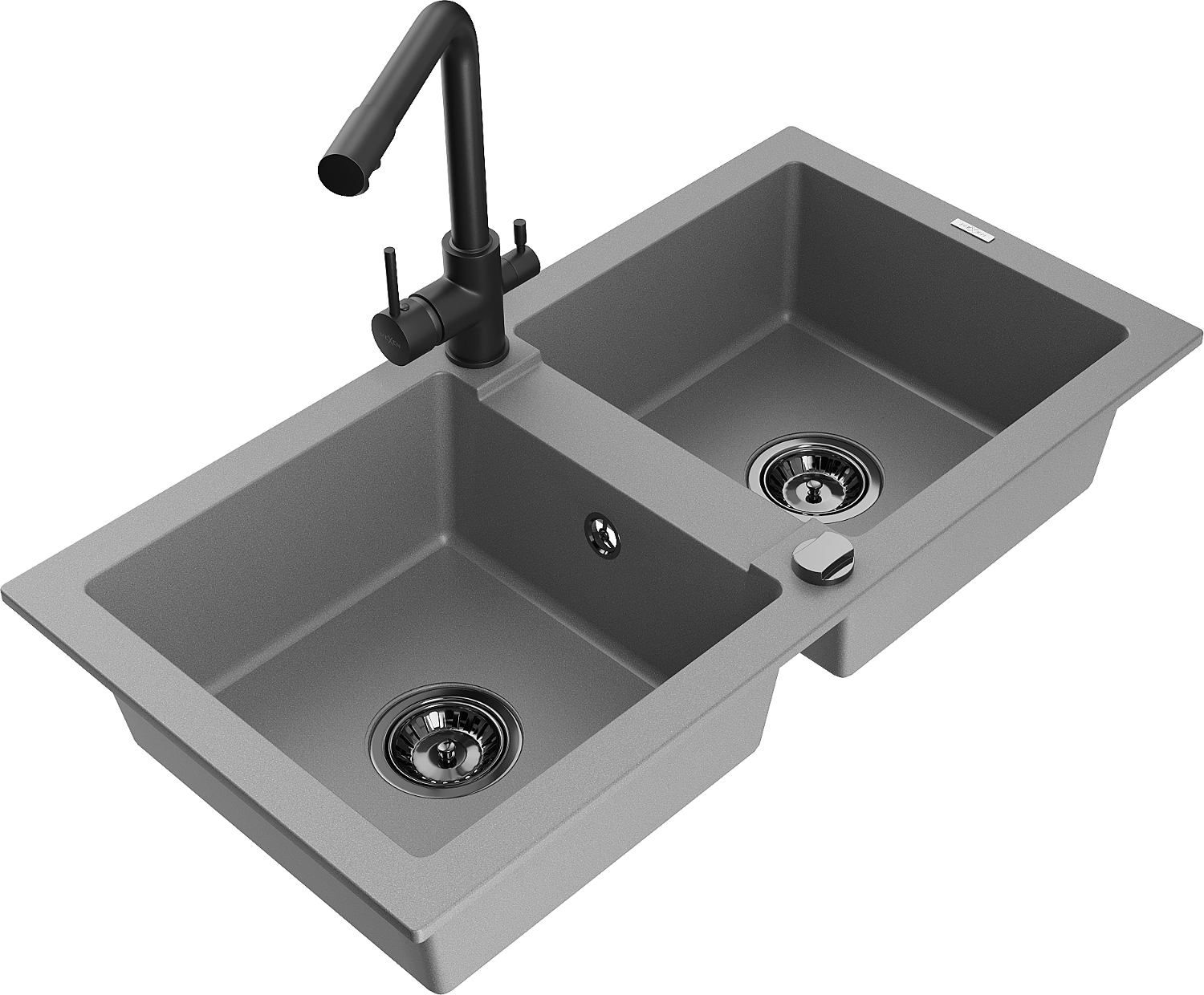 Mexen Mario granitový kuchynský drez s dvoma komorami a kuchynskou batériou Duero, sivý - 6504-71-671600-70-B