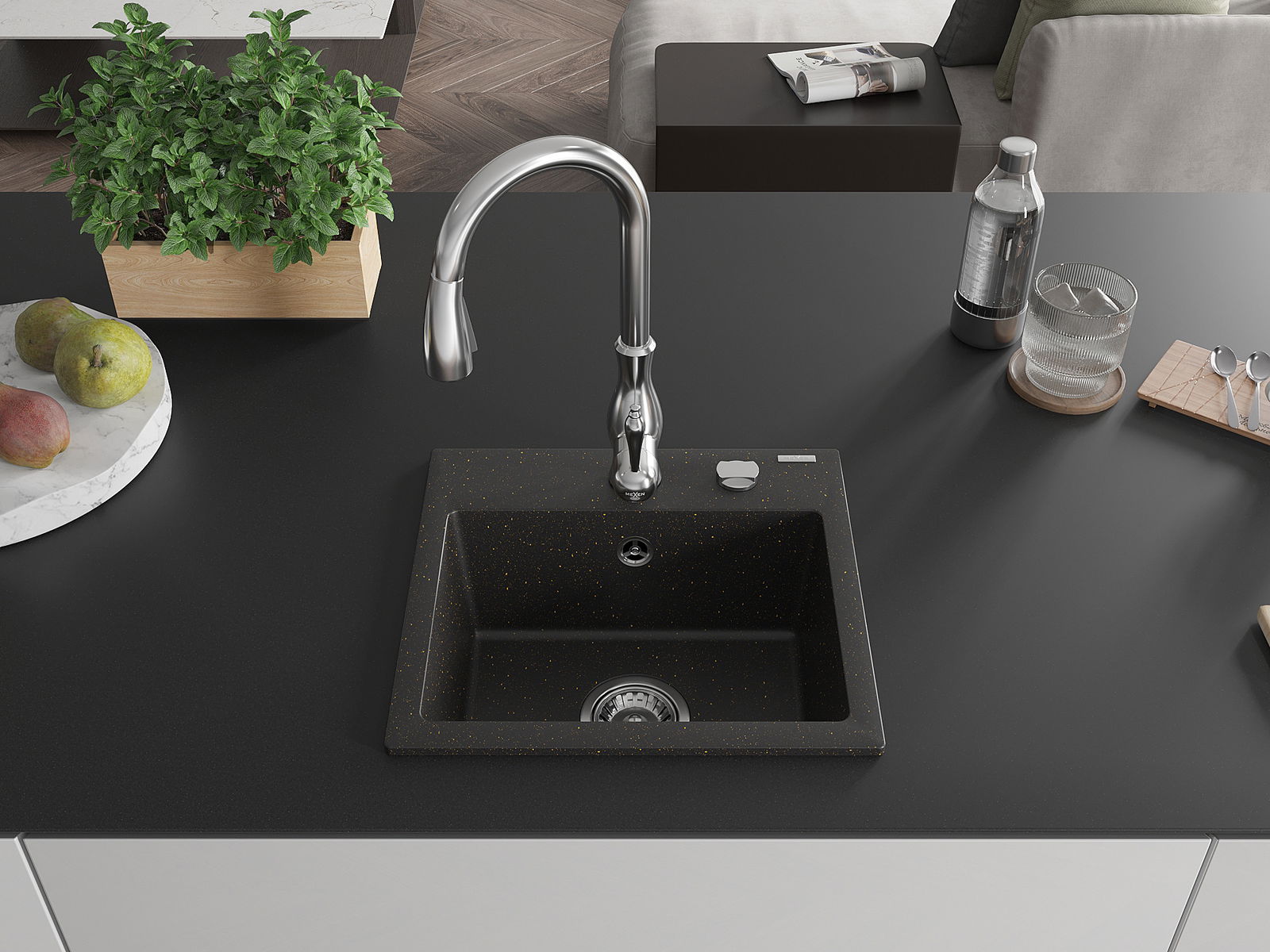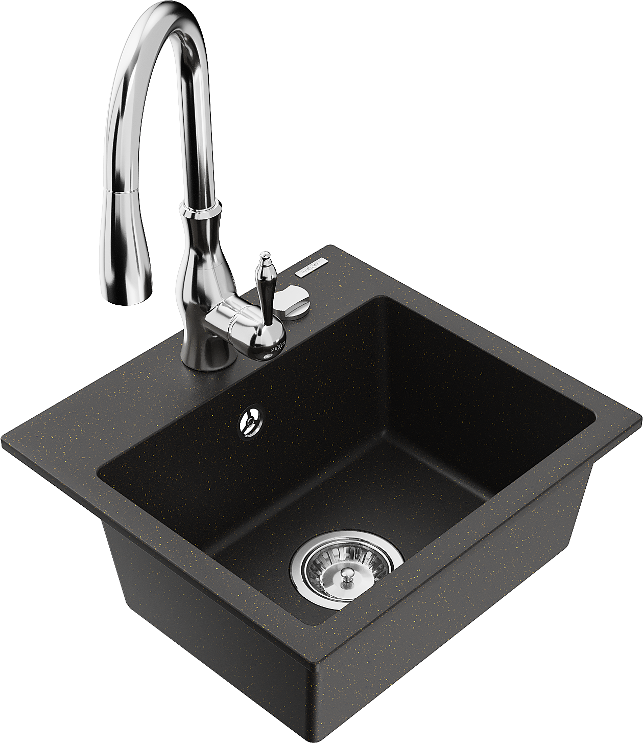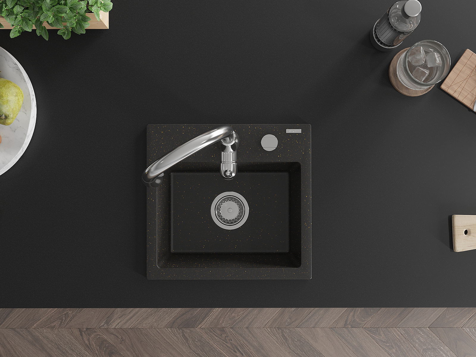 Mexen Milo jednorazový granitový drez s kuchynskou batériou Savita, čierno/zlatý metalický- 6505-75-672601-00