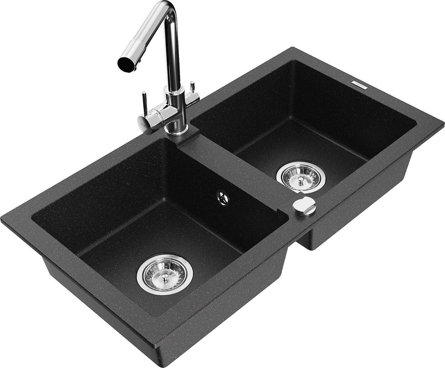 Mexen Mario žulový dvojkomorový drez s kuchynskou batériou Duero, čierny/strieborný metalik - 6504-73-671600-00