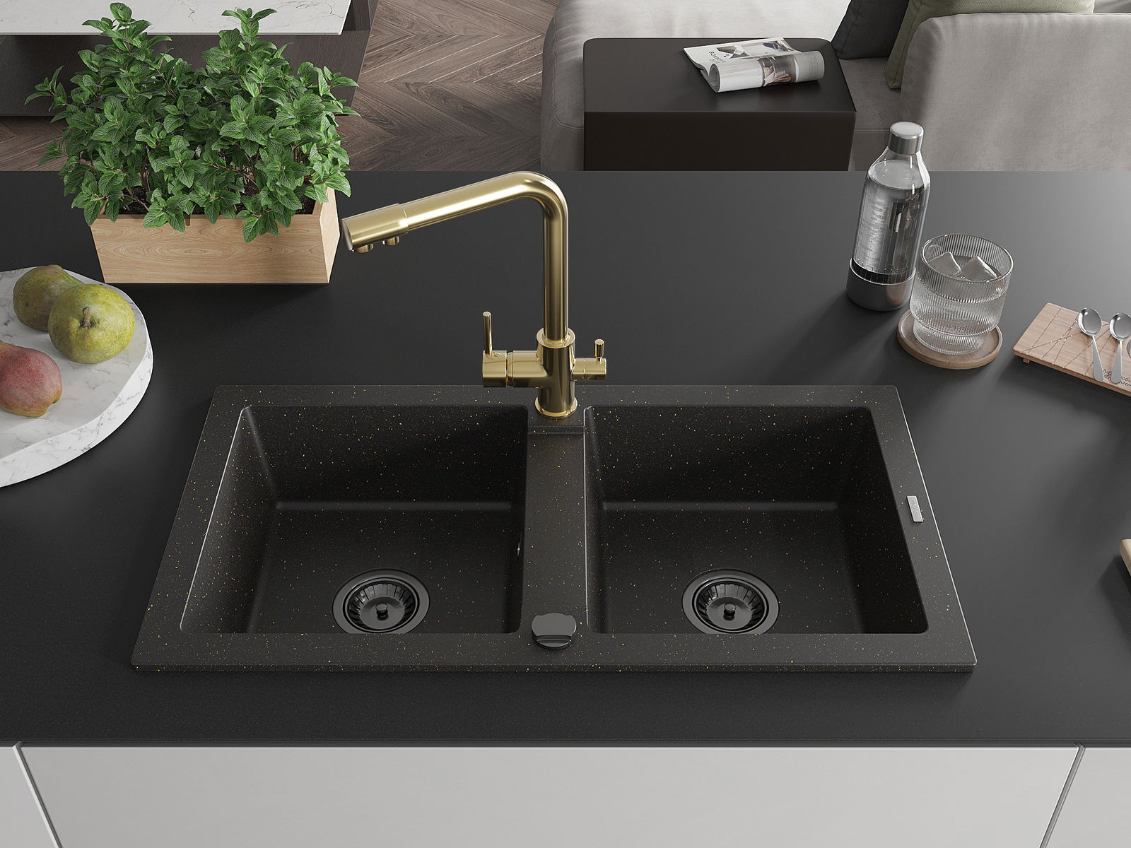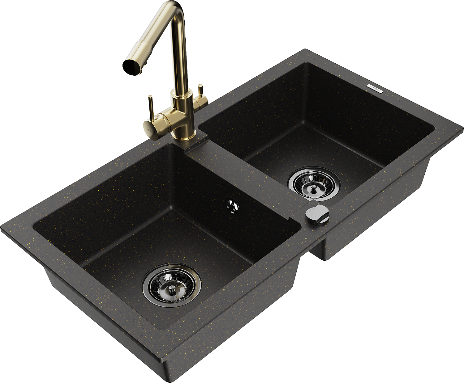 Mexen Mario dvojkomorový žulový kuchynský drez s kuchynskou batériou Duero, čierna/zlatý metalik - 6504-75-671600-50-B