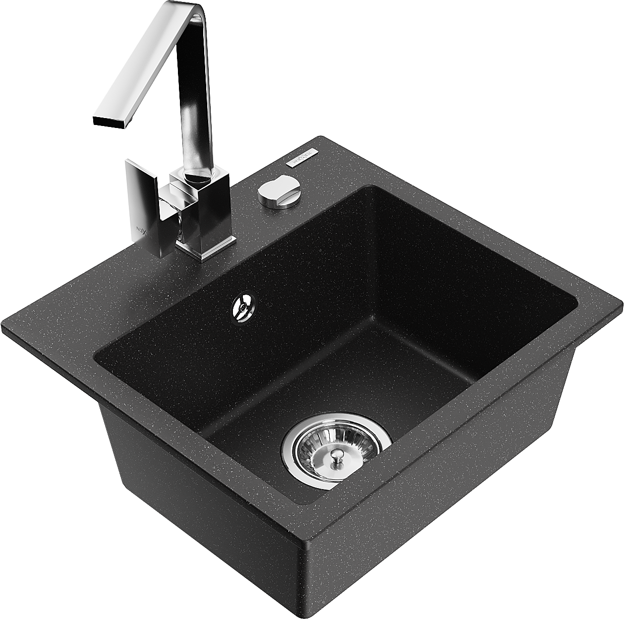 Mexen Milo žulový kuchynský drez 1-komorový s kuchynskou batériou Rita, čierny/strieborný metalik - 6505-73-670300-00