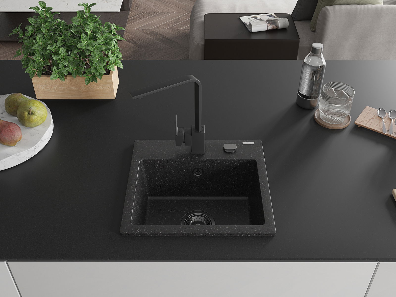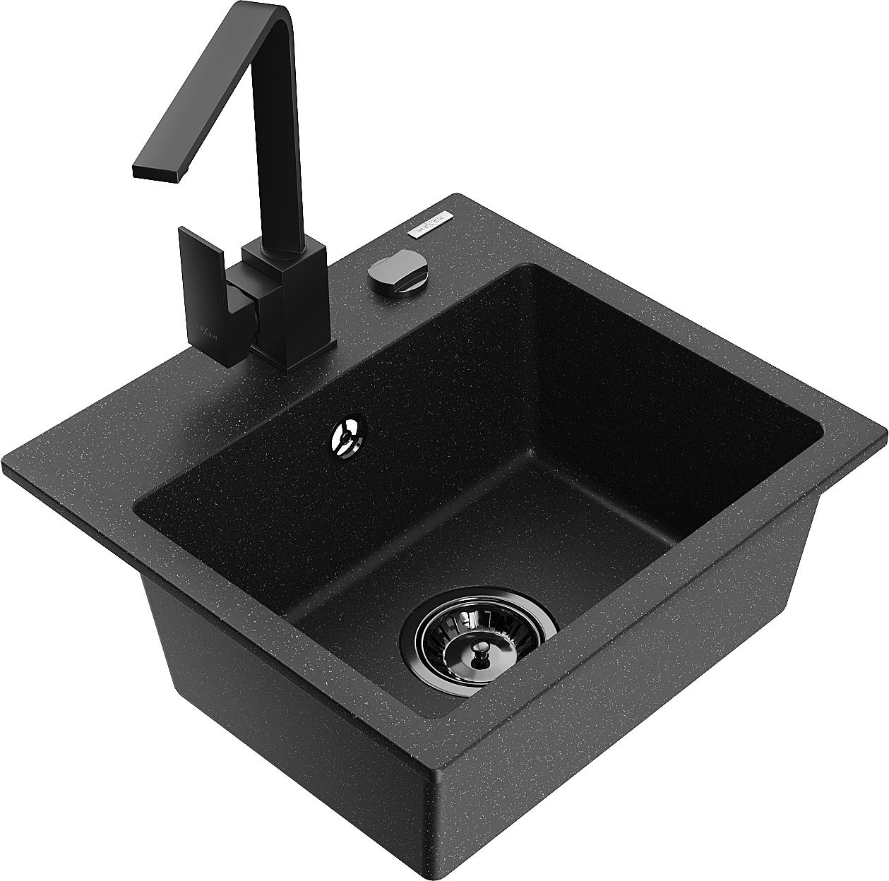 Mexen Milo granitový drez 1-komorový s kuchynskou batériou Rita, čierno/strieborný metalik - 6505-73-670300-70-B