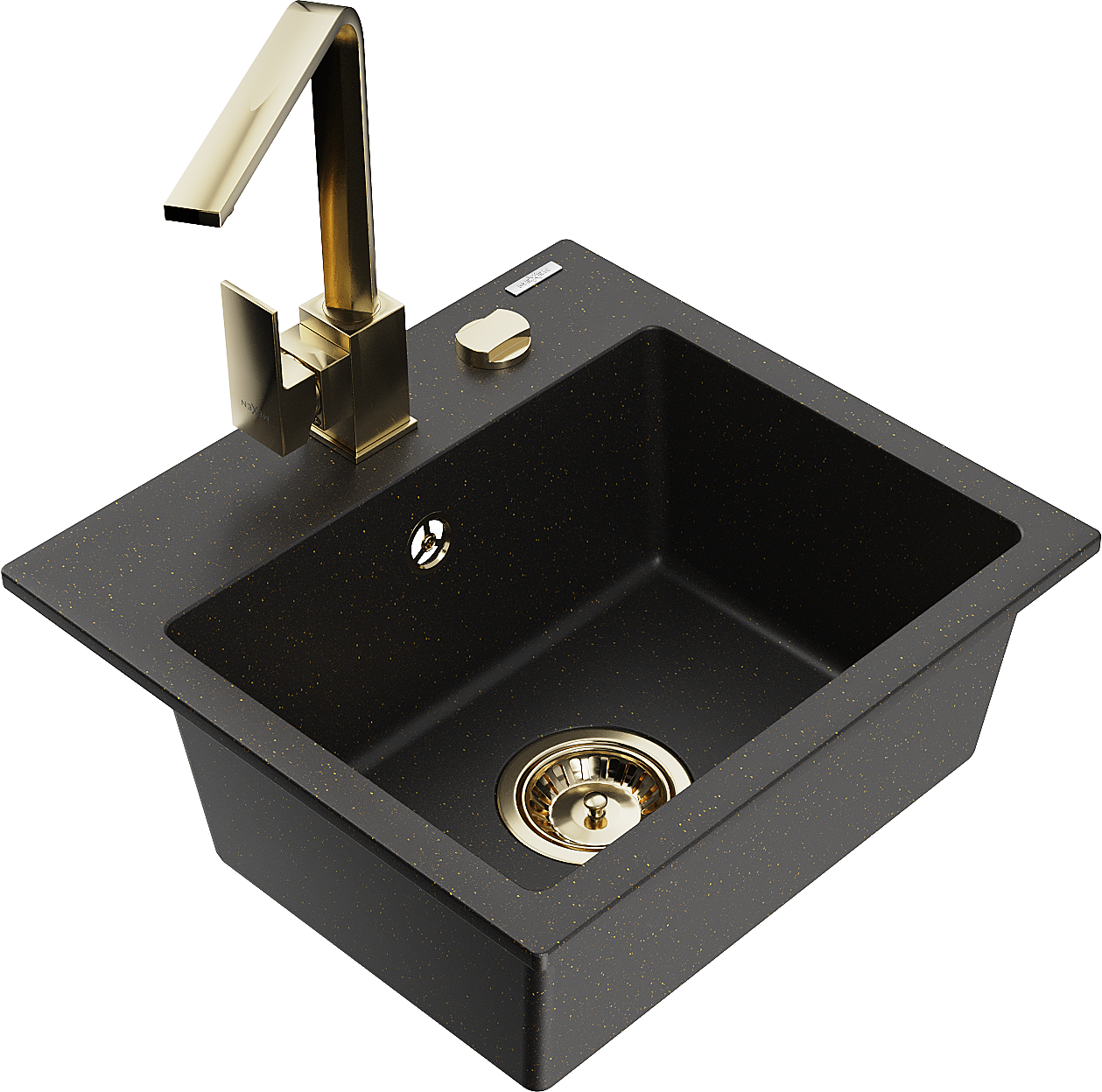 Mexen Milo žulový drez 1-komorový s kuchynskou batériou Rita, čierny/zlatý metalík - 6505-75-670300-50