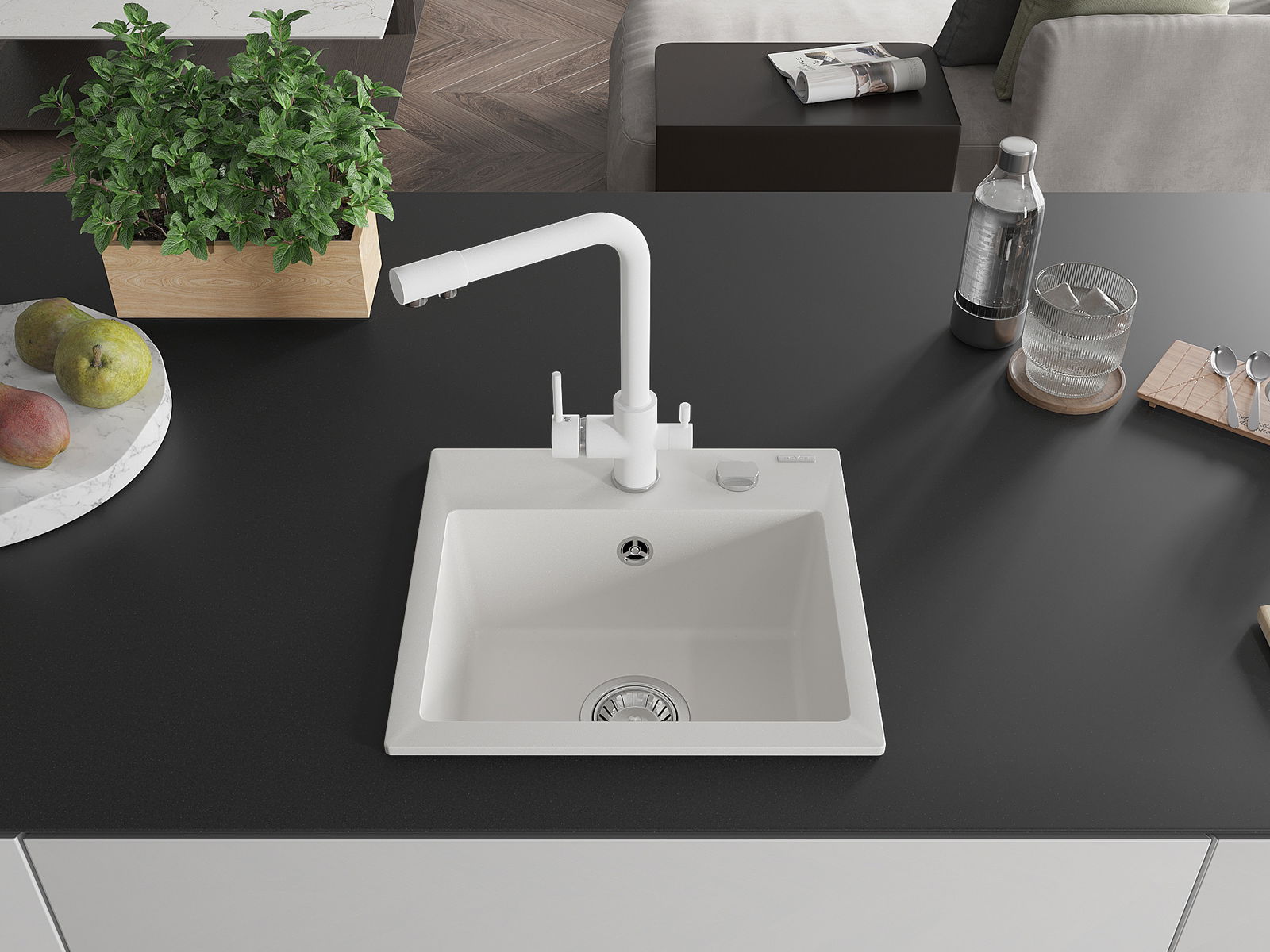 Drez má predfrézovaný otvor s priemerom 35 mm na samostatné prerazenie. Môže sa využiť napríklad na montáž dávkovača na tekutinu, ktorý eliminuje prítomnosť plastových fliaš v kuchyni a pridáva jej elegantné dokončenie.