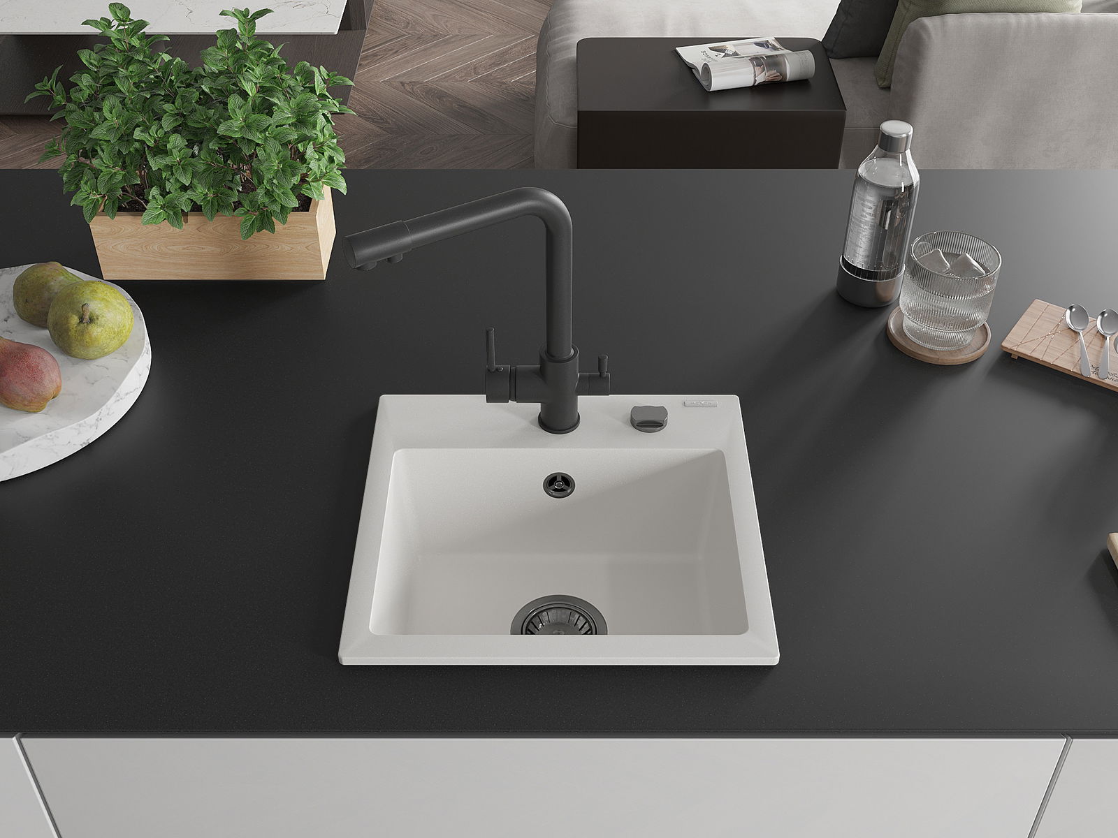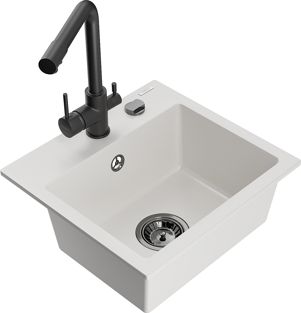 Mexen Milo granitový drez 1-komorový s kuchynskou batériou Duero, biely - 6505-20-671600-70