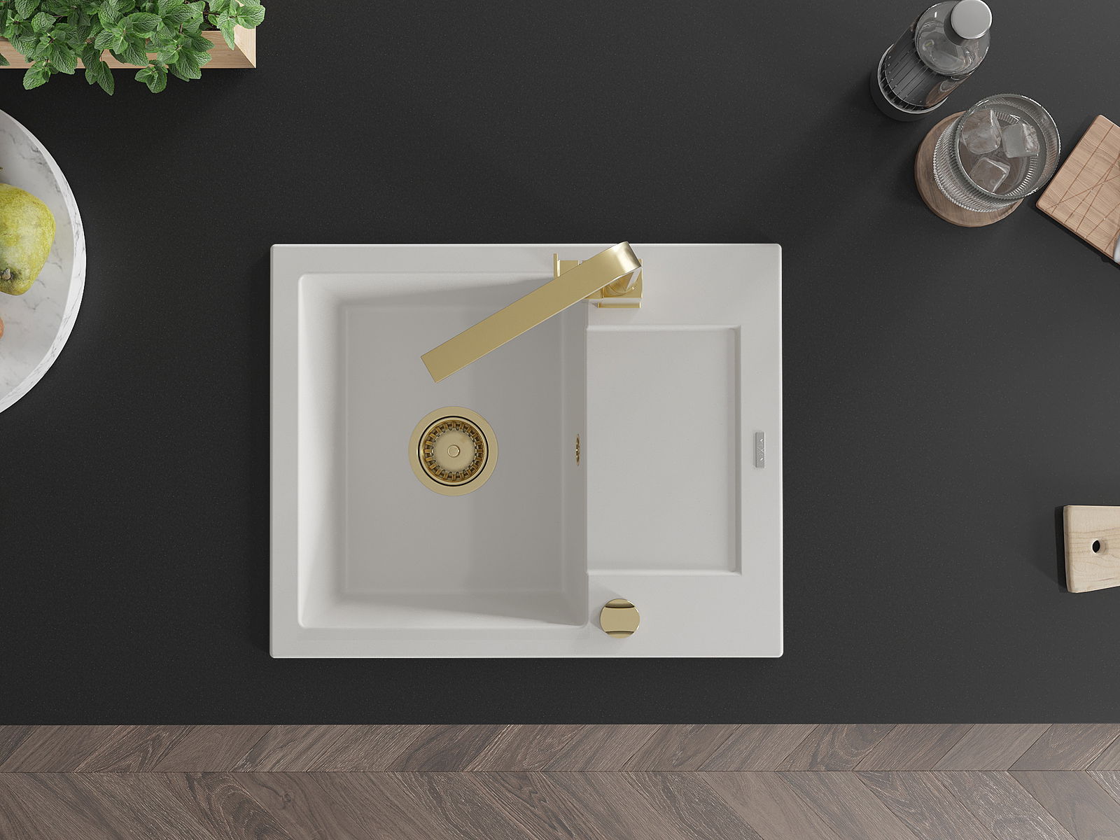 Mexen Enzo žulový drez 1-komorový s odkvapkávačom a kuchynskou batériou Rita, biely - 6506-20-670300-50