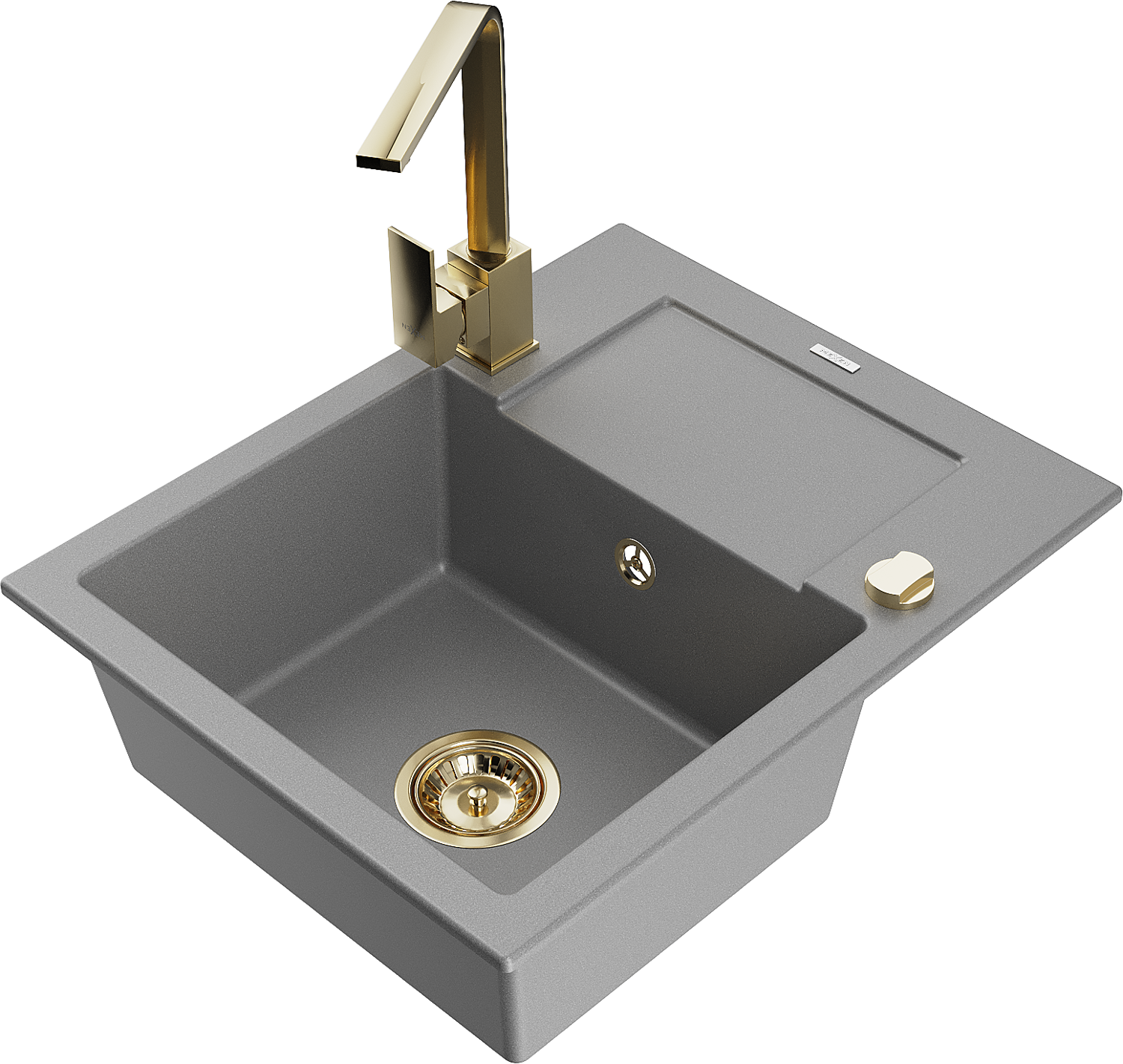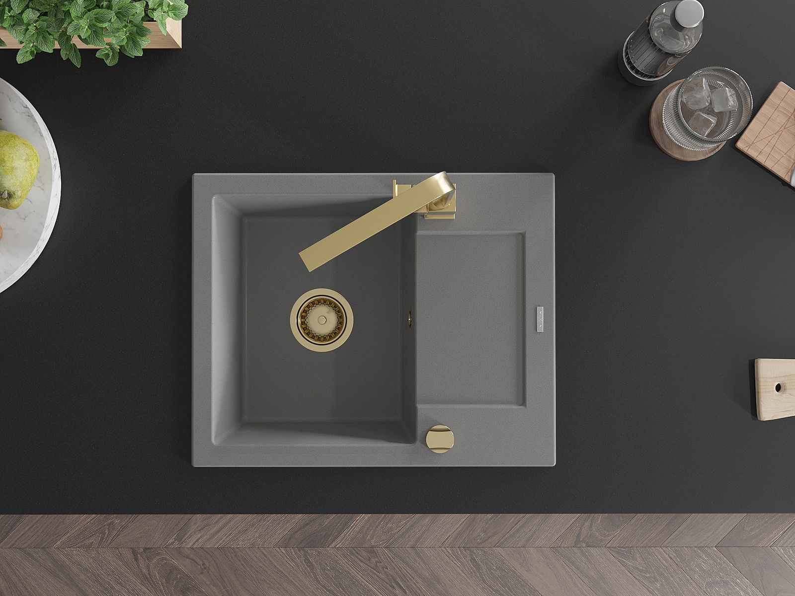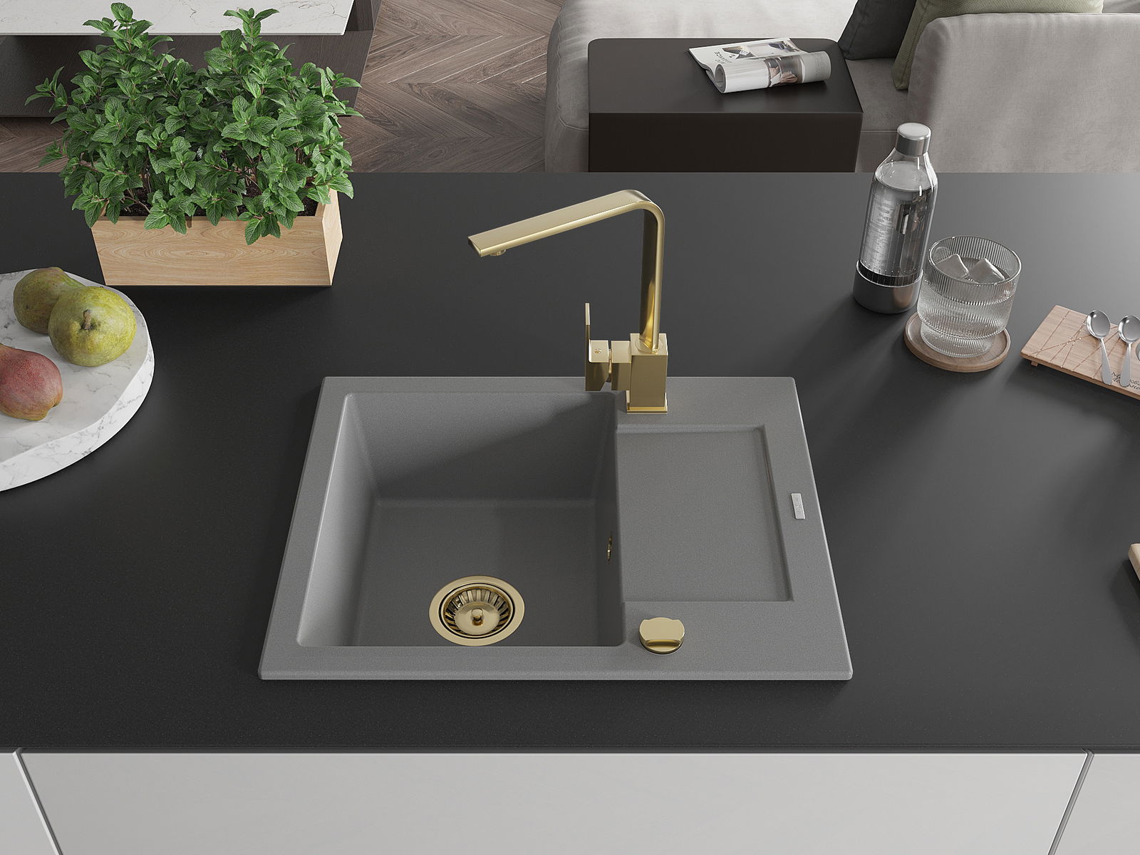 Mexen Enzo granitový kuchynský drez s 1 komorou a odkvapkávacou doskou a kuchynskou batériou Rita, sivý - 6506-71-670300-50
