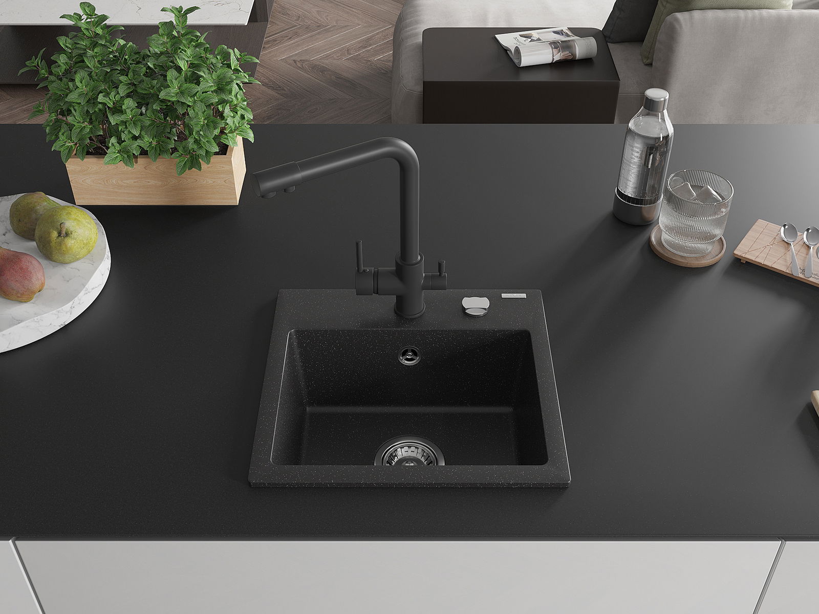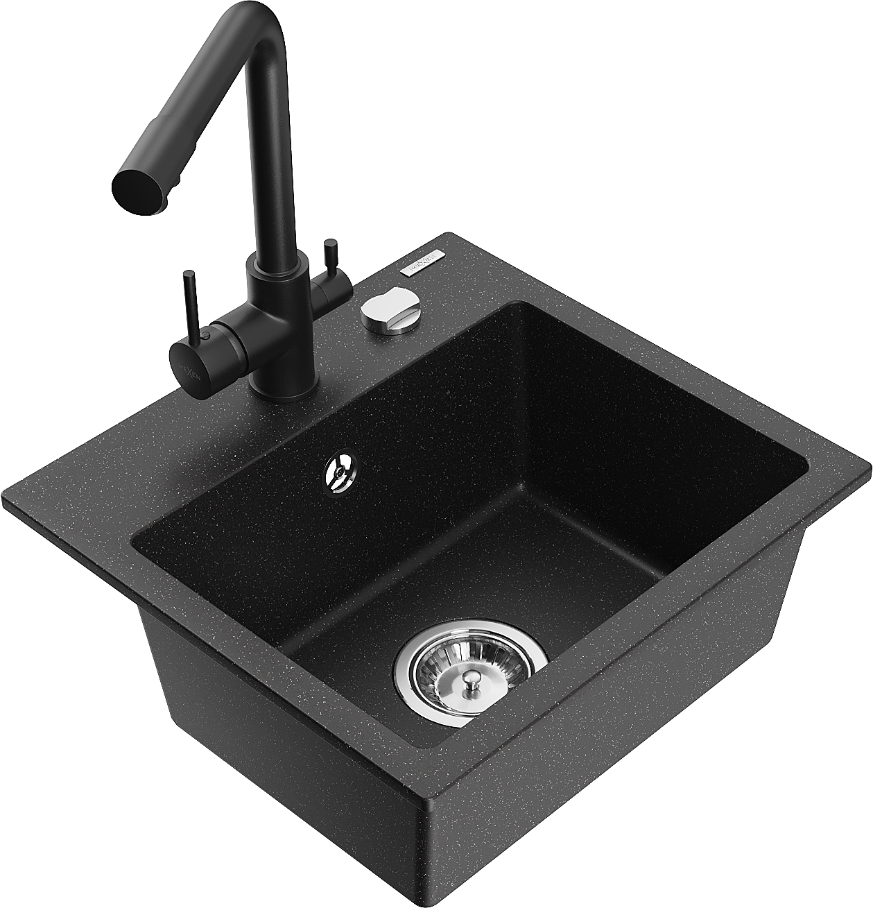 Mexen Milo žulový drez s 1 komorou s kuchynskou batériou Duero, čierna/strieborný metalický - 6505-73-671600-70