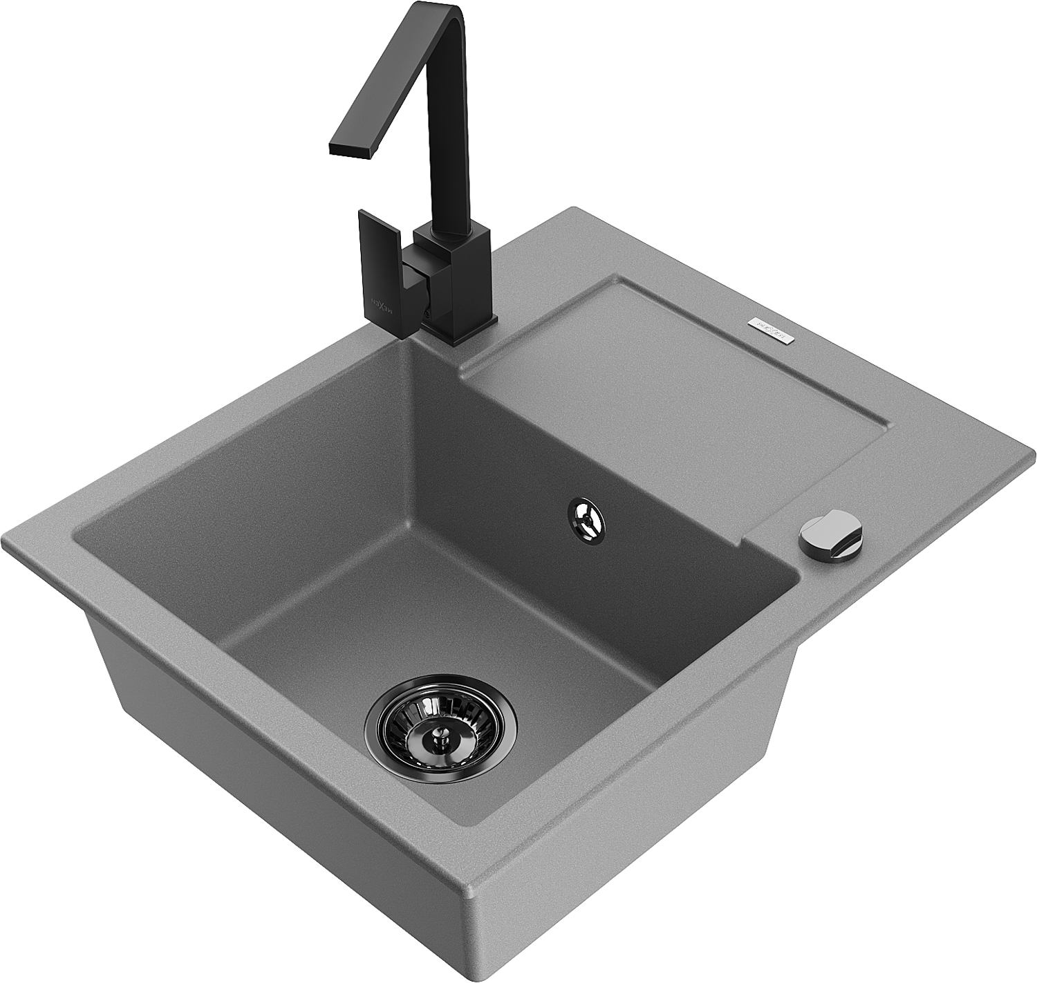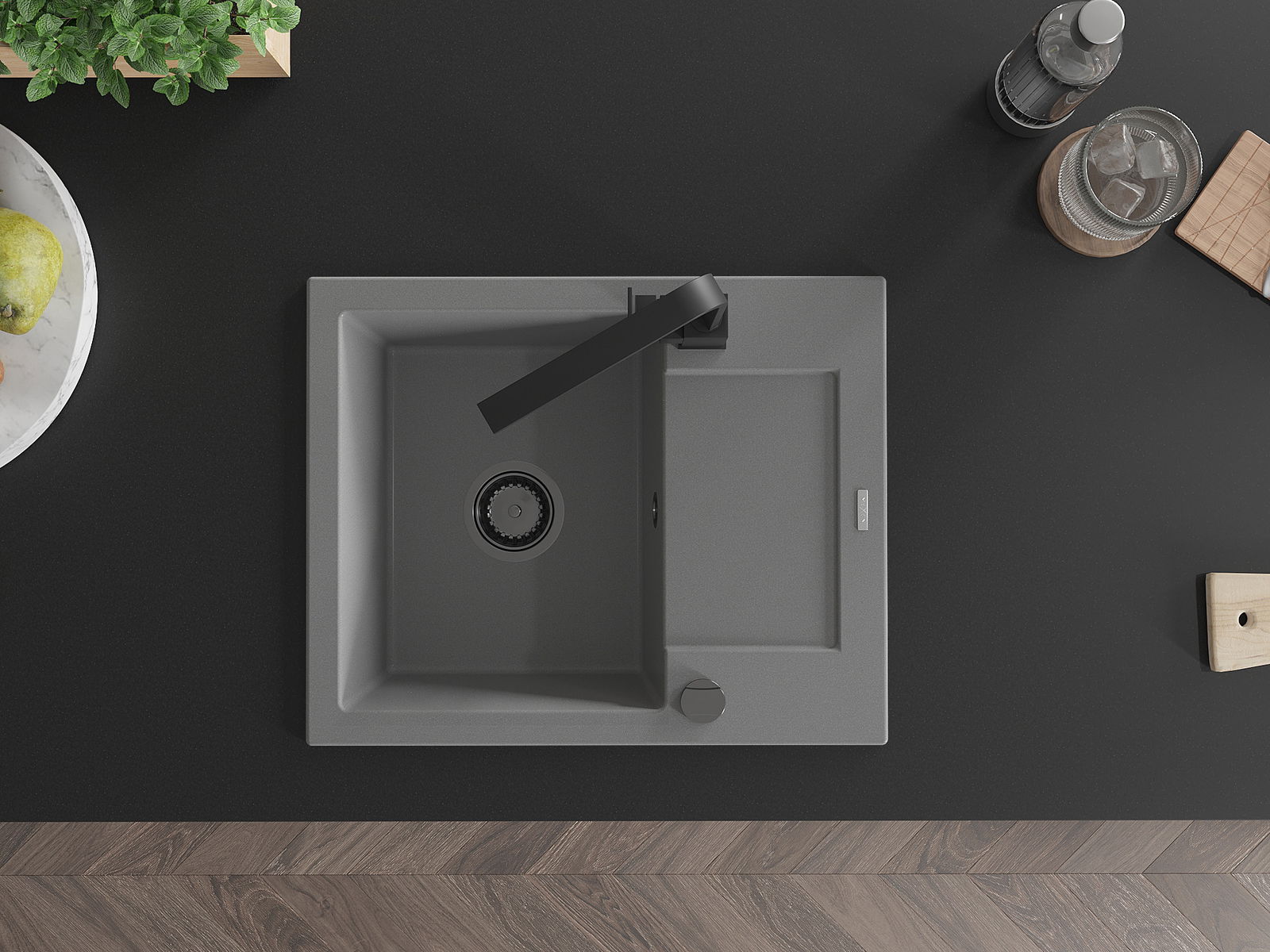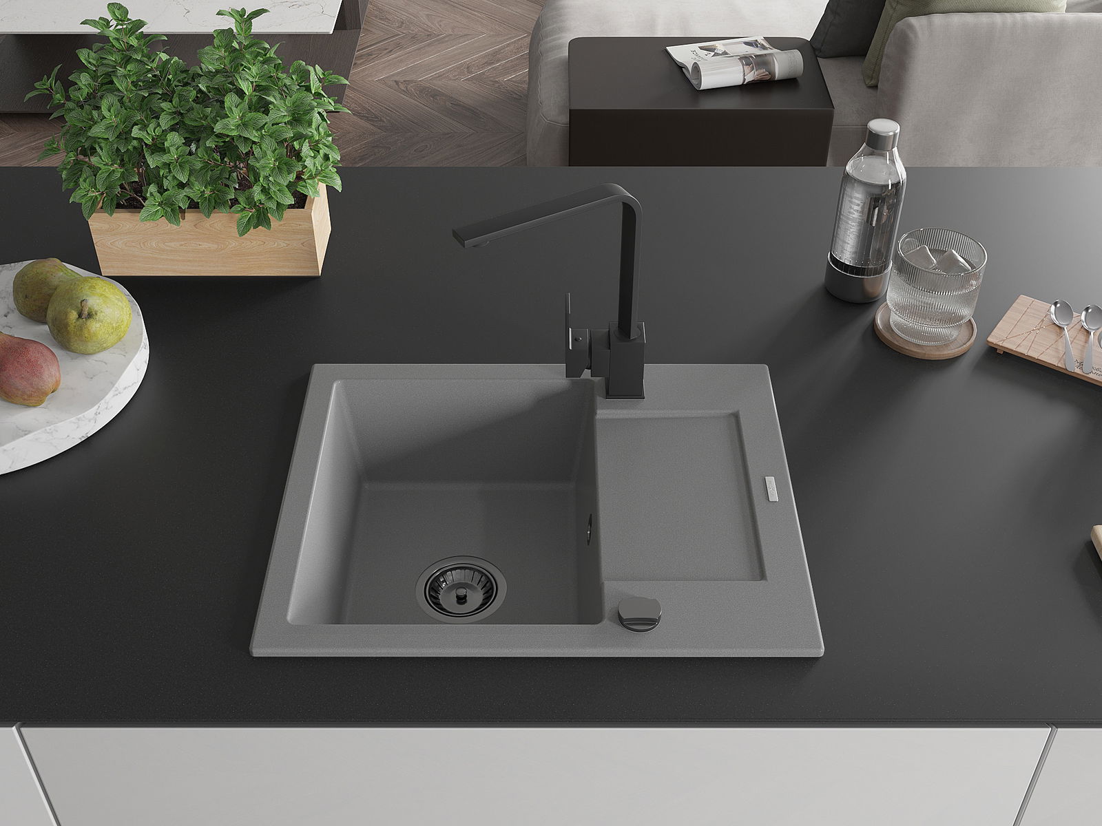 Mexen Enzo granitový drez s 1 komorou a odkvapkávačom a kuchynskou batériou Rita, sivý - 6506-71-670300-70-B