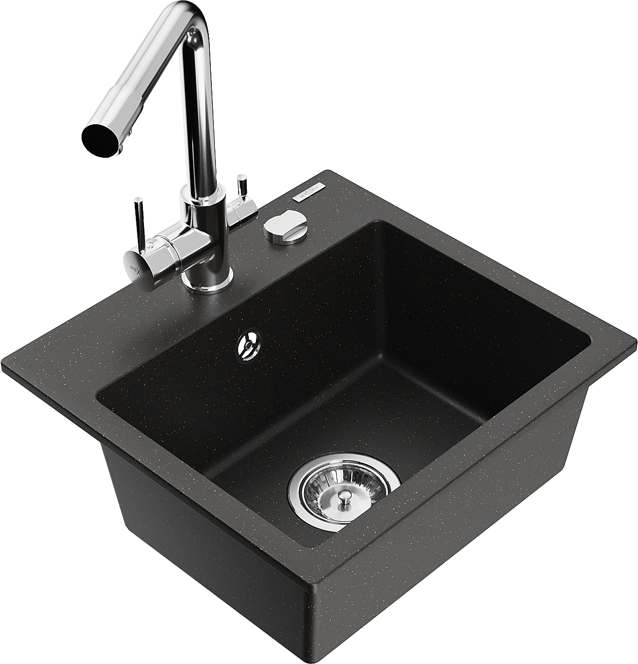 Mexen Milo granitový kuchynský drez s 1 komorou a kuchynskou batériou Duero, čierny/zlatý metalik - 6505-75-671600-00