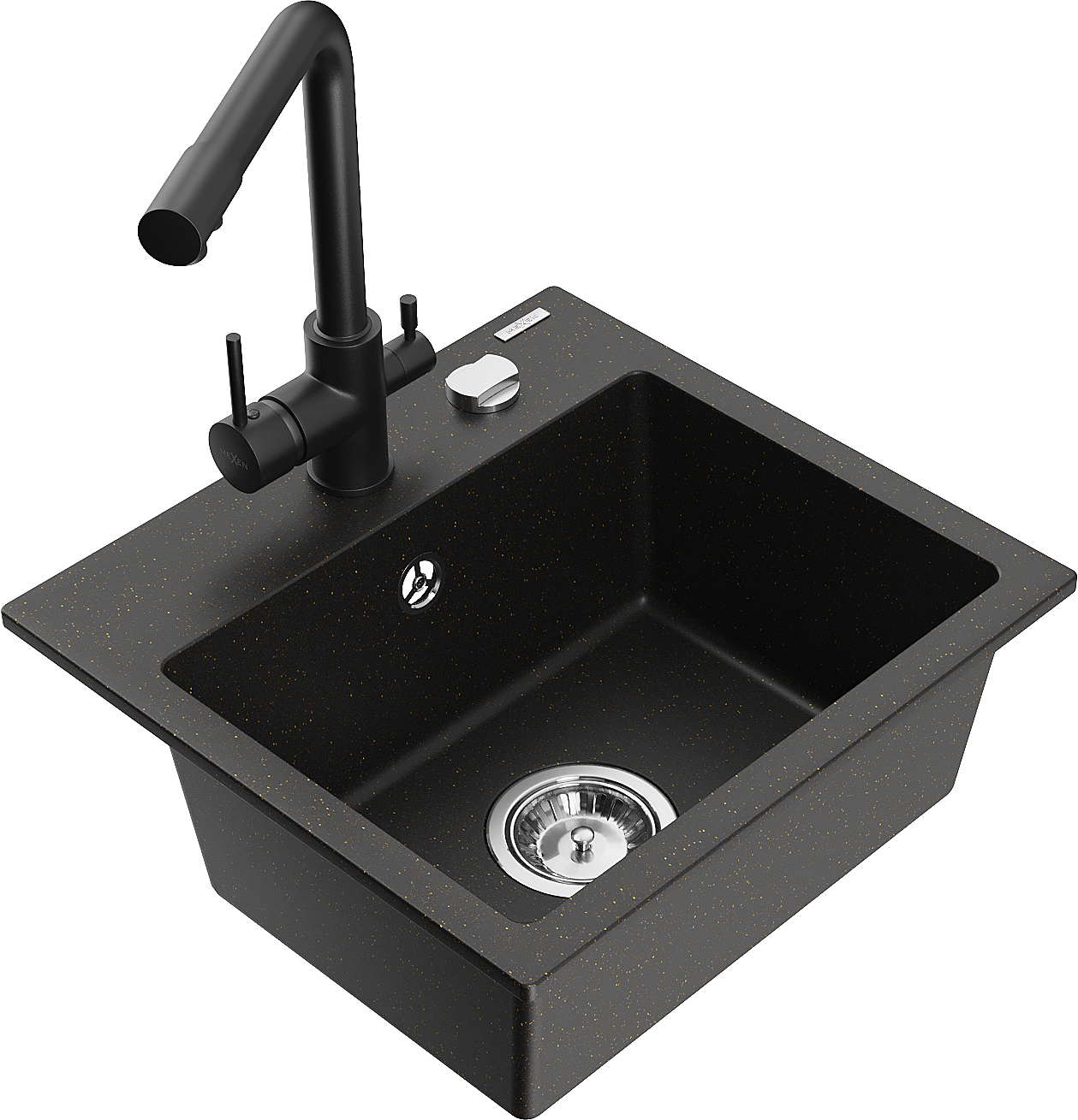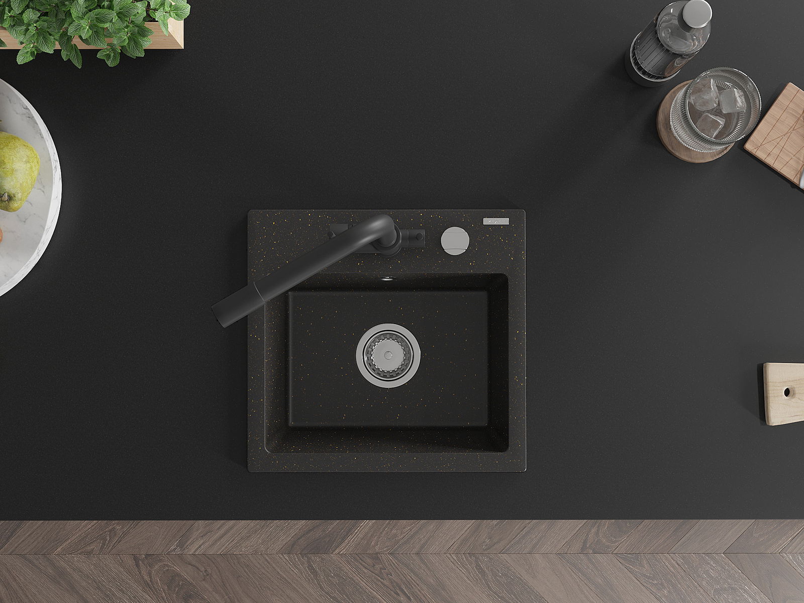 Mexen Milo kuchynský drez granitový 1-komorový s kuchynskou batériou Duero, čierny/zlatý metalik - 6505-75-671600-70