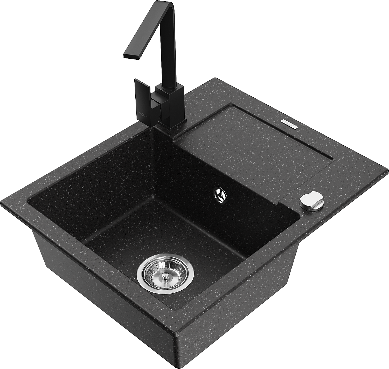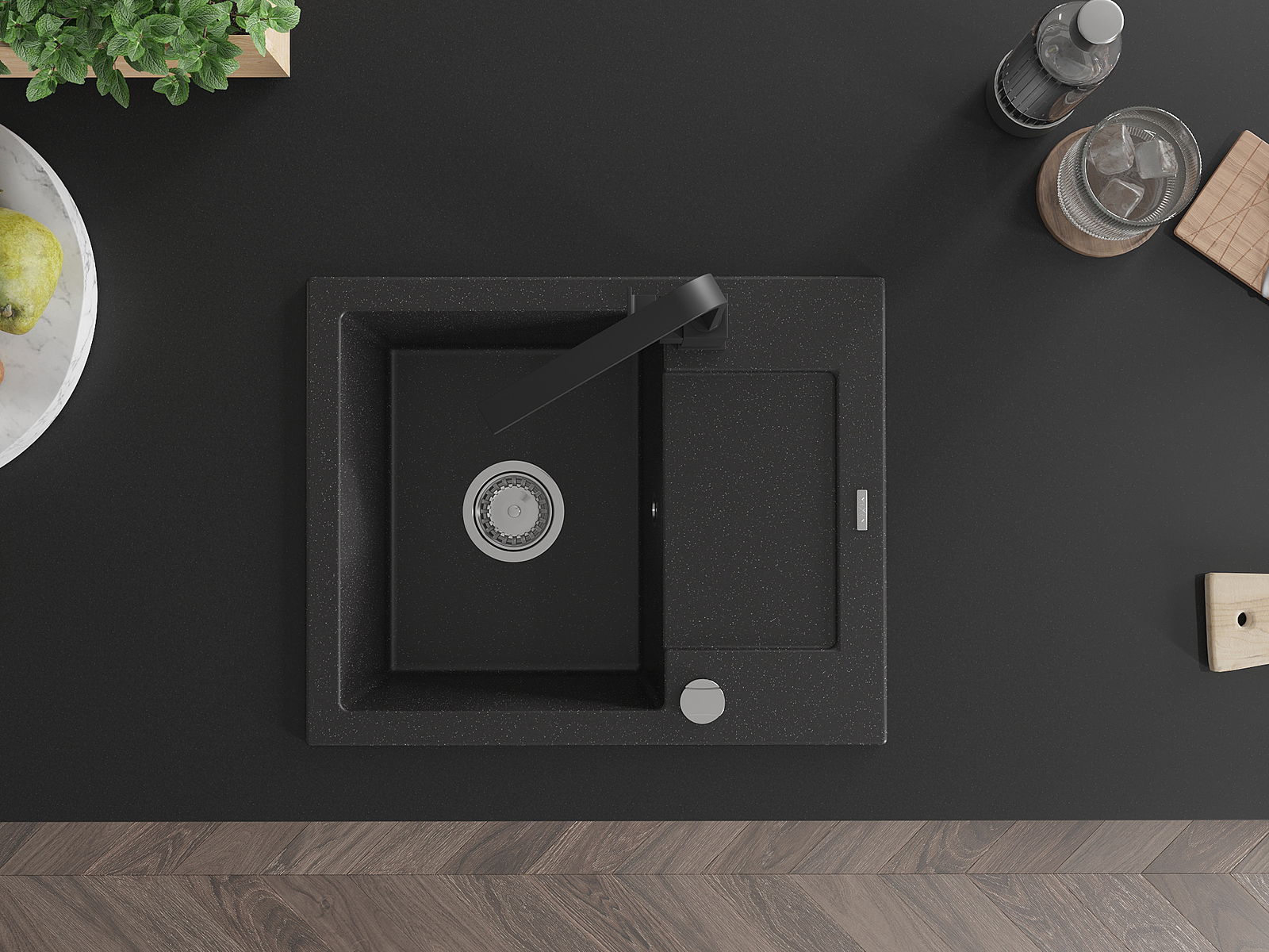 Mexen Enzo granitový jednodrezový kuchynský drez s odkvapkávačom a kuchynskou batériou Rita, čierny/strieborný metalik