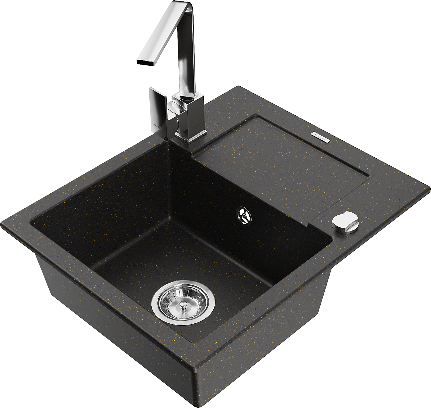Mexen Enzo žulový kuchynský drez s 1 komorou, odkvapom a kuchynskou batériou Rita, čierny/zlatý metalik - 6506-75-670300-00