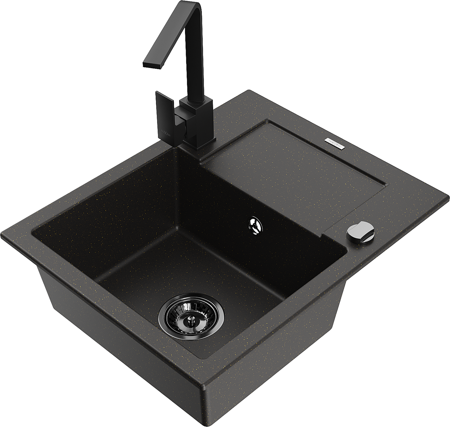Mexen Enzo granitový kuchynský drez s 1 komorou s odkvapkávačom a kuchynskou batériou Rita, čierna/zlatý metalický