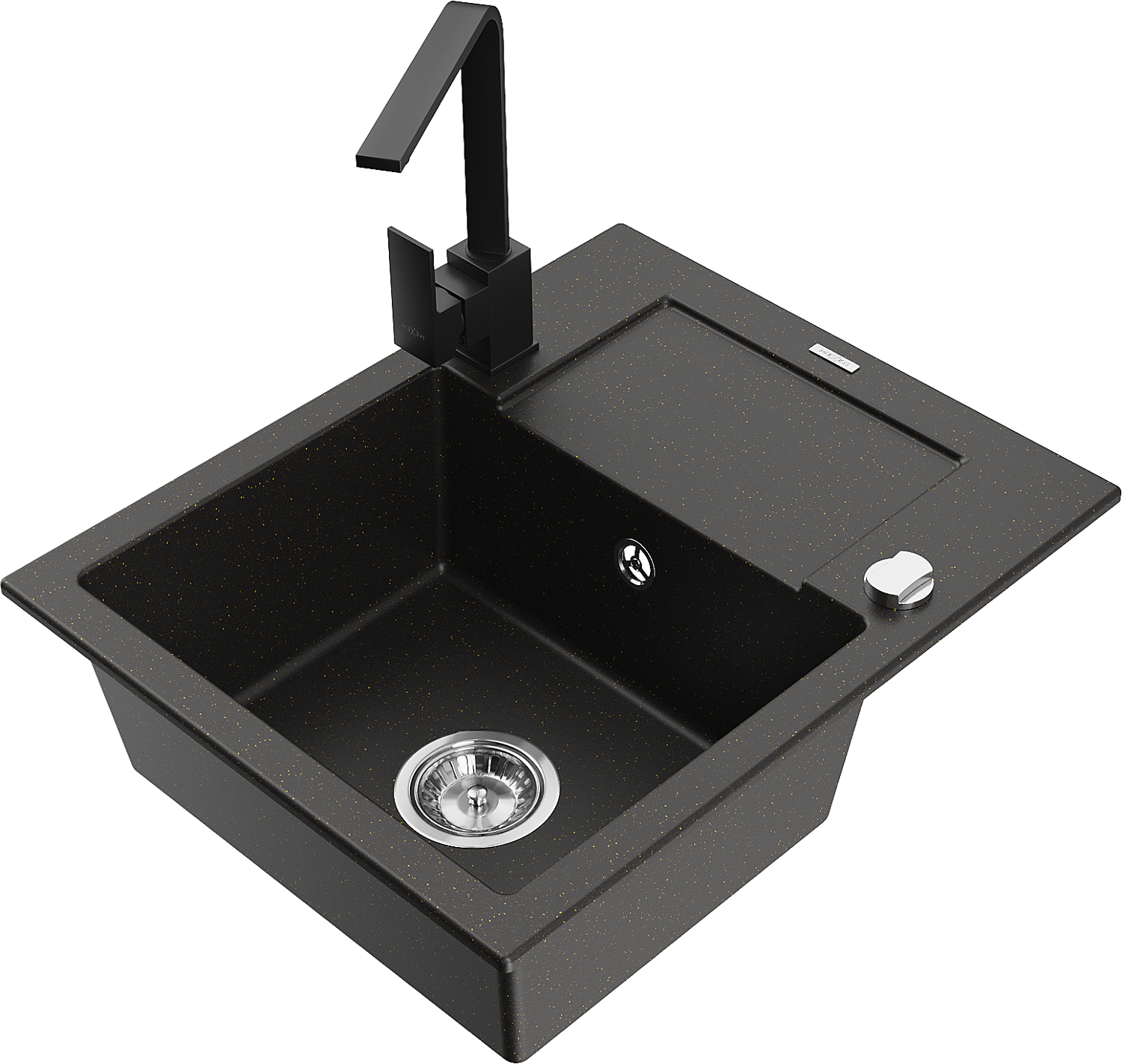 Mexen Enzo granitový kuchynský drez s 1 komorou a odkapávačom a kuchynská batéria Rita, čierny/zlatý metalický