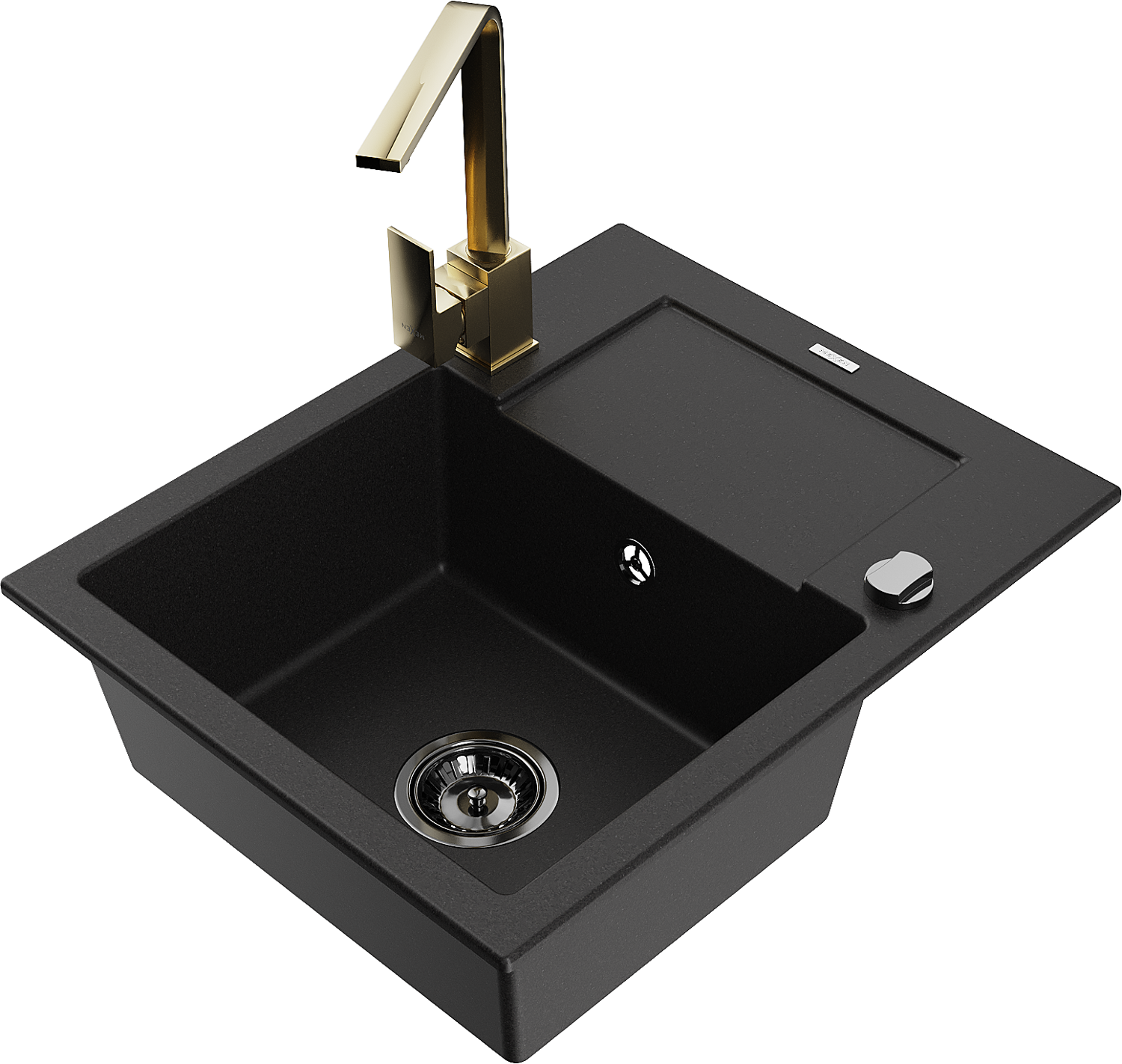Mexen Enzo kuchynský drez granitový 1-komorový s odkvapkávačom a kuchynskou batériou Rita, čierny - 6506-77-670300-50-B