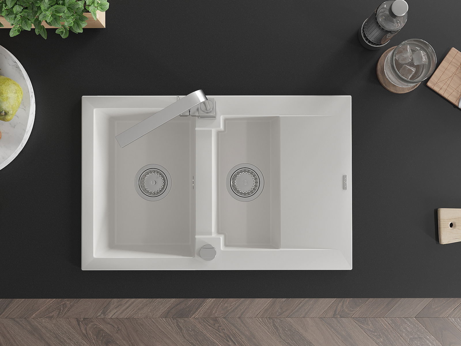 Povrch kuchynského drezu je odolný voči škvrnám a zafarbeniu, vďaka čomu sa ľahko udržiava a zachováva svoju farbu počas dlhého obdobia používania. Estetický a praktický doplnok pre každú kuchyňu.