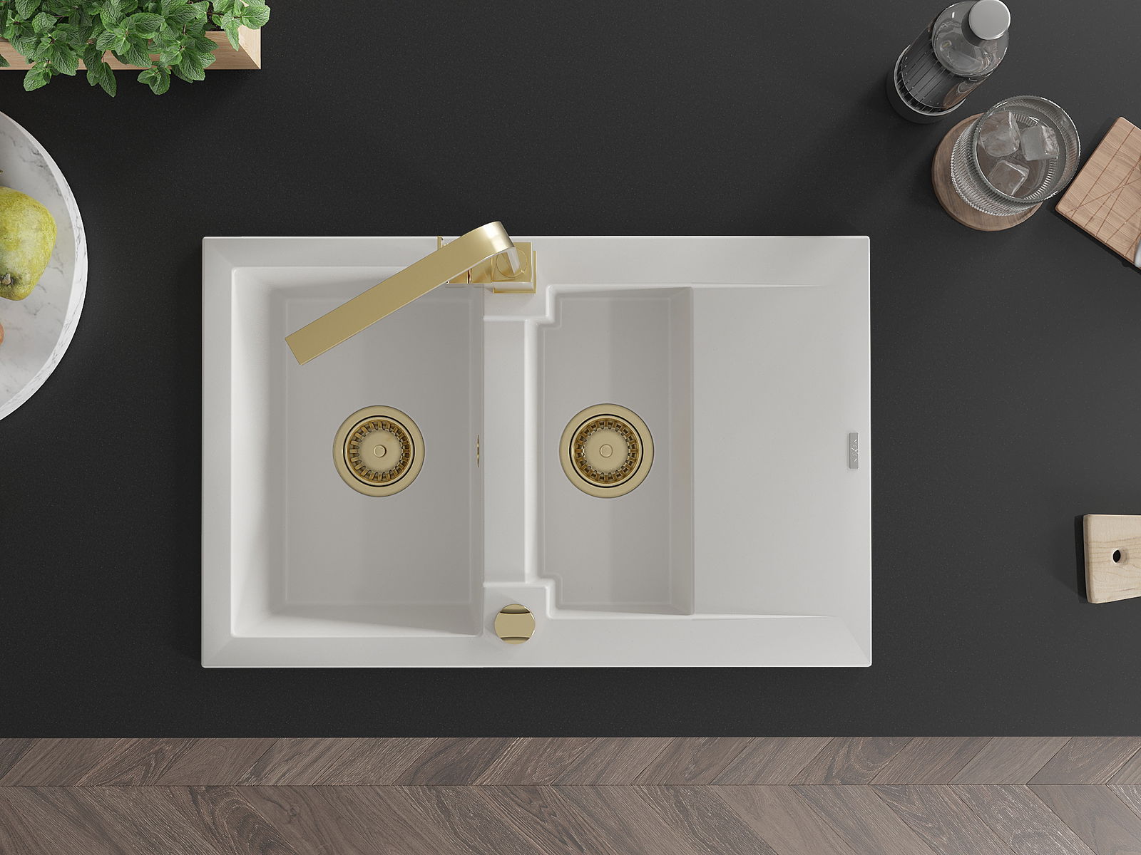 Mexen Gaspar granitový drez 1,5-komorový s odkvapkávačom a kuchynskou batériou Rita, biely - 6507-20-670300-50