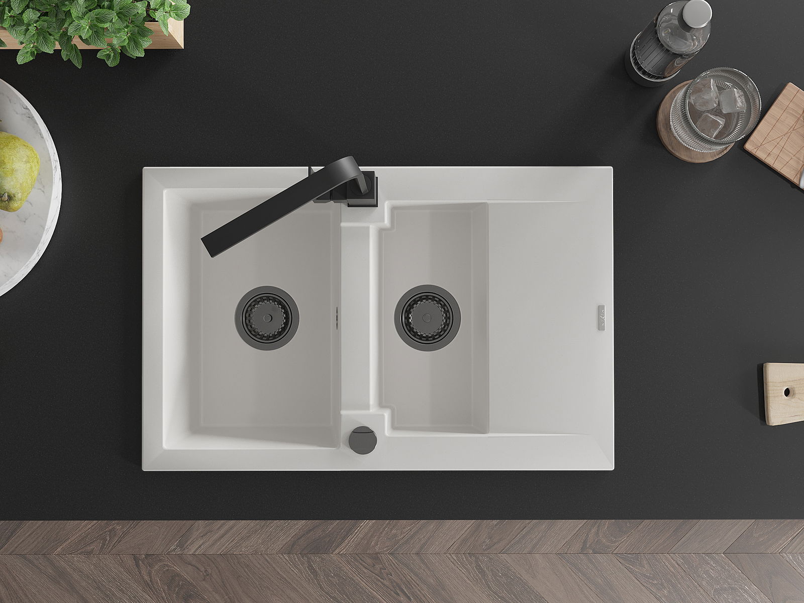 Mexen Gaspar žulový drez 1,5-komorový s odkvapkávacou plochou a kuchynskou batériou Rita, biela - 6507-20-670300-70