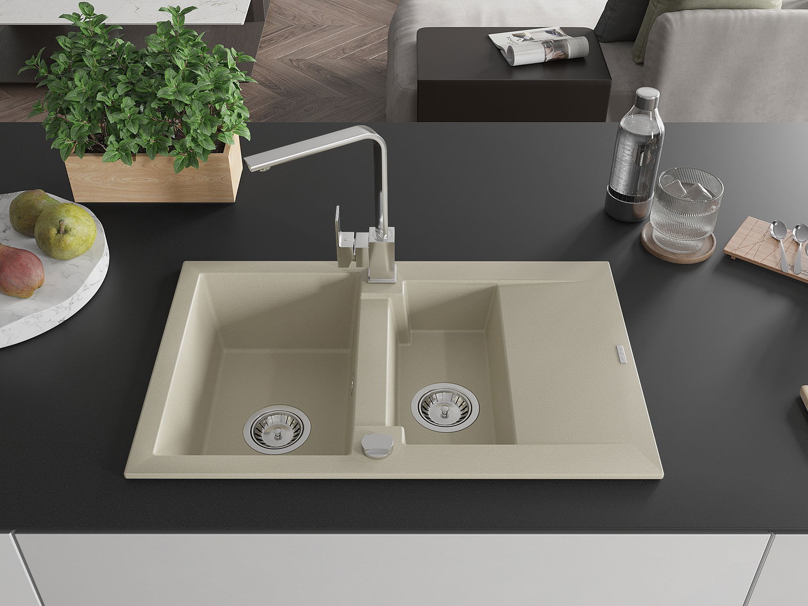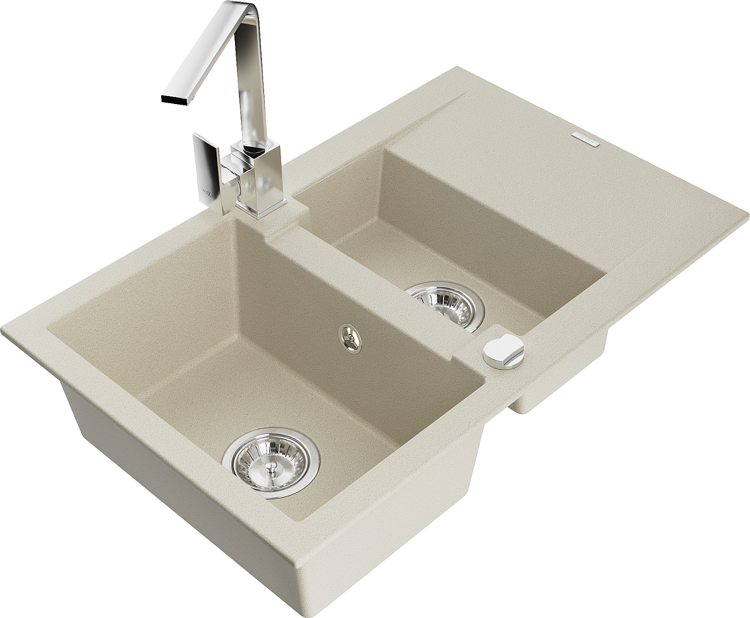 Mexen Gaspar granitový drez s 1,5 komorami, odkvapkávacou plochou a kuchynskou batériou Rita, béžový - 6507-69-670300-00