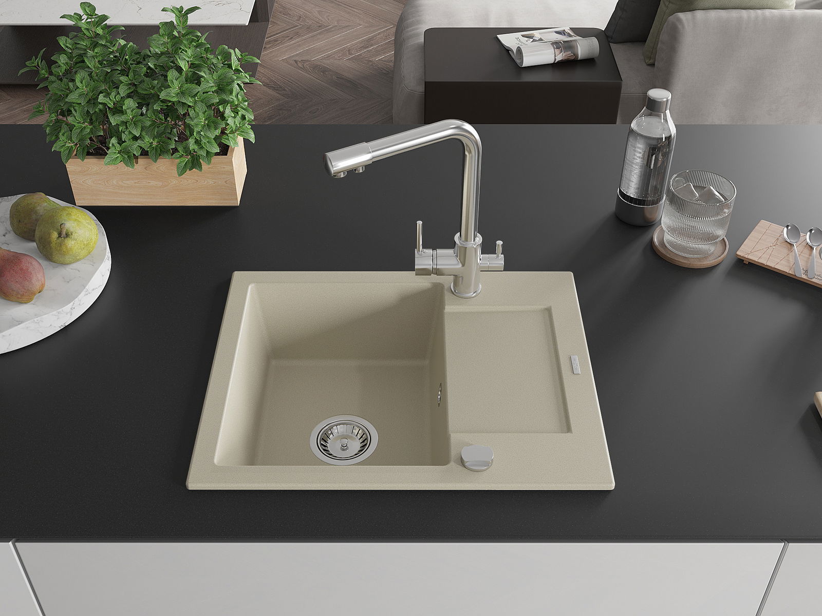 Povrch umývadla je odolný voči škvrnám a sfarbeniu, vďaka čomu sa ľahko čistí a zachováva si svoju farbu po dlhú dobu. Estetický a prakticky dopĺňajúci každú kuchyňu.