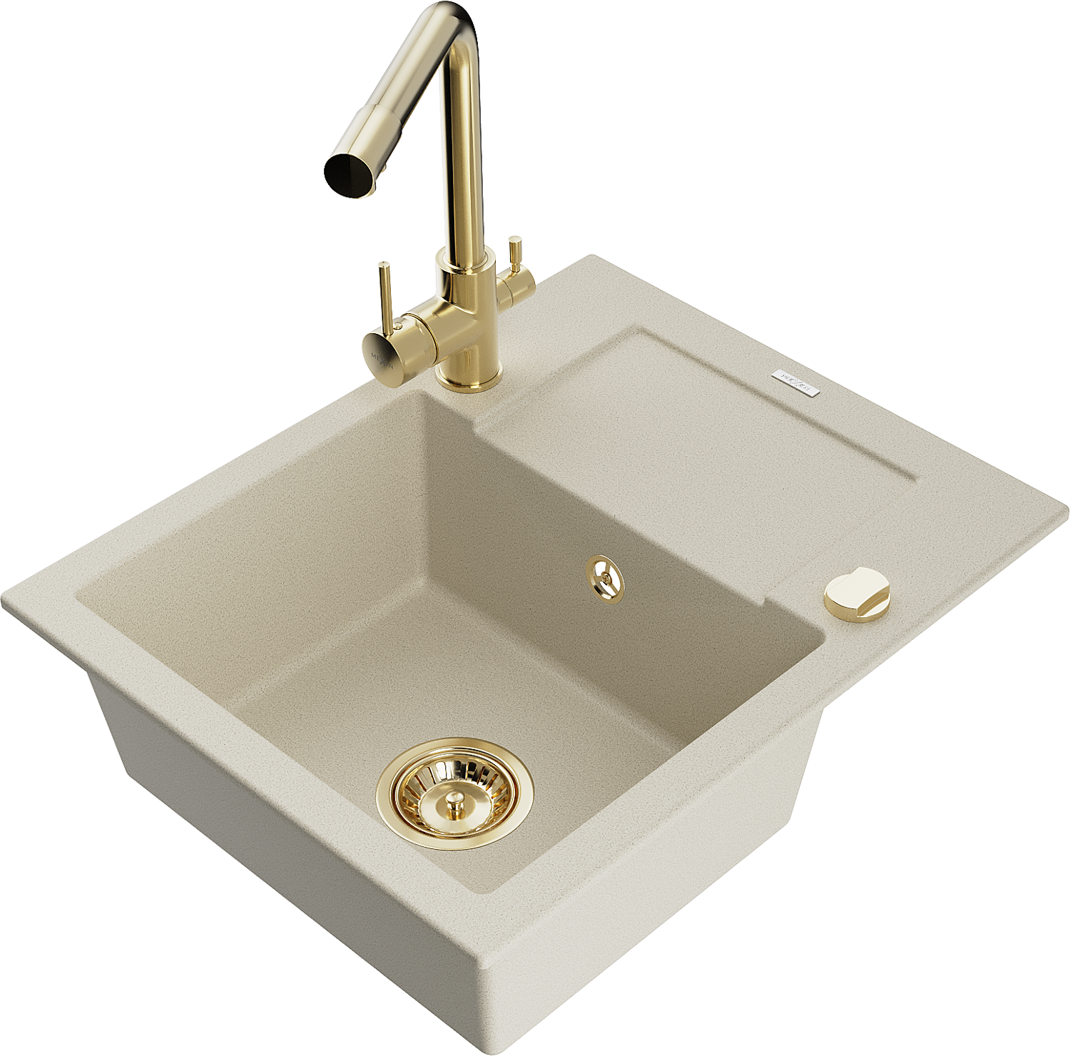 Mexen Enzo granitový drez 1-komorový s odkvapkávačom a kuchynskou batériou Duero, béžový - 6506-69-671600-50