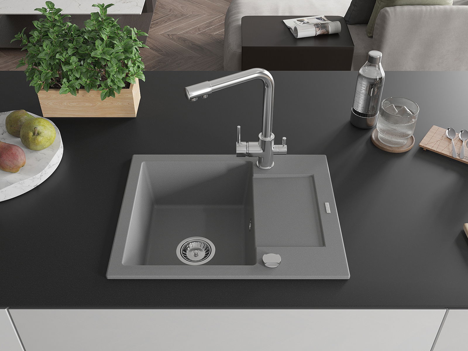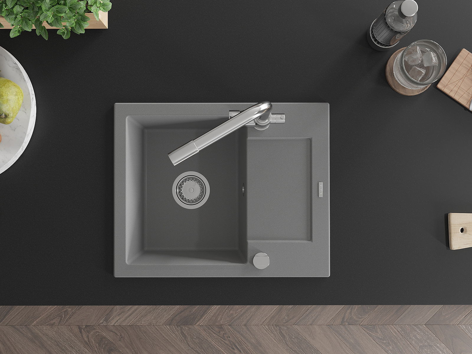 Mexen Enzo žulový drez 1-komorový s odkvapkávacom a kuchynskou batériou Duero, sivý - 6506-71-671600-00