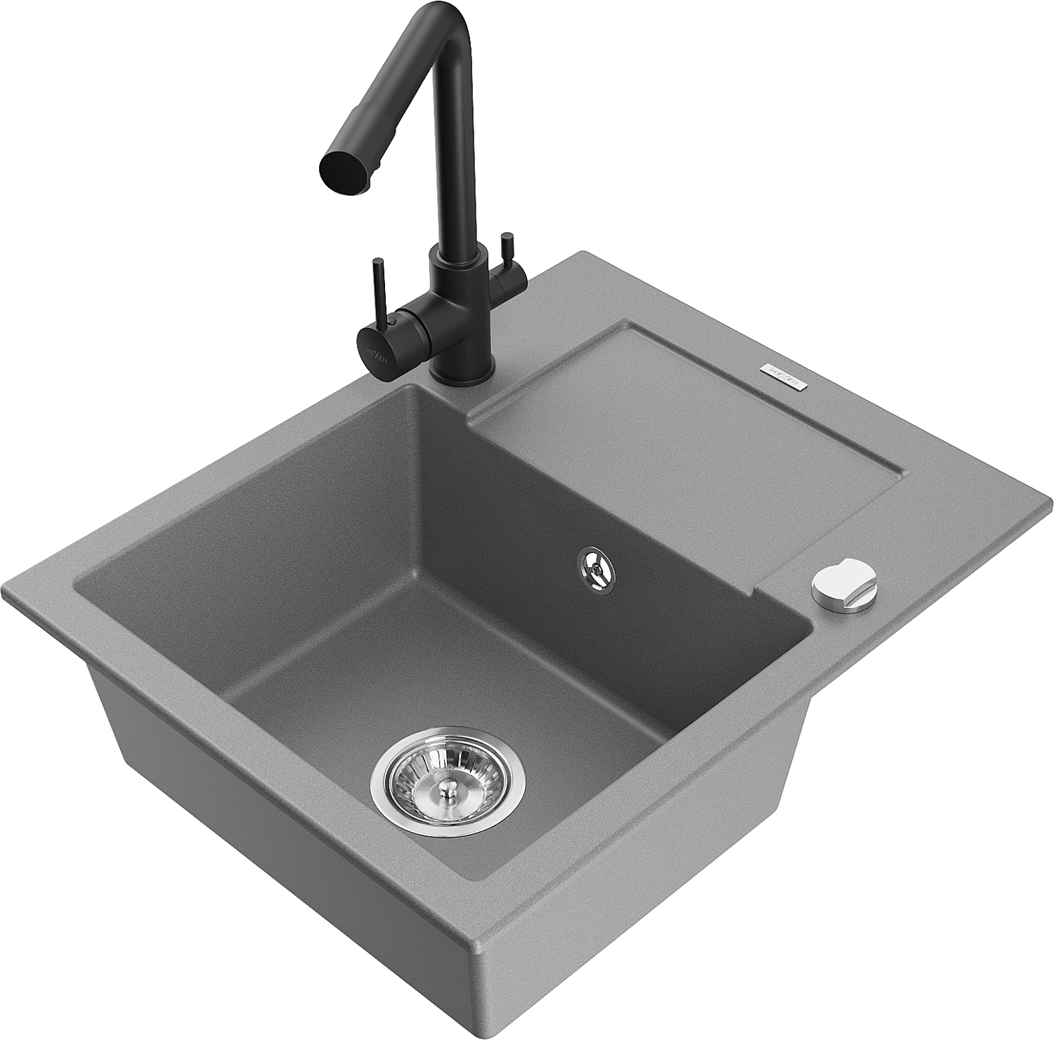 Mexen Enzo granitový drez s 1 komorou, odkvapkávačom a kuchynskou batériou Duero, sivý - 6506-71-671600-70