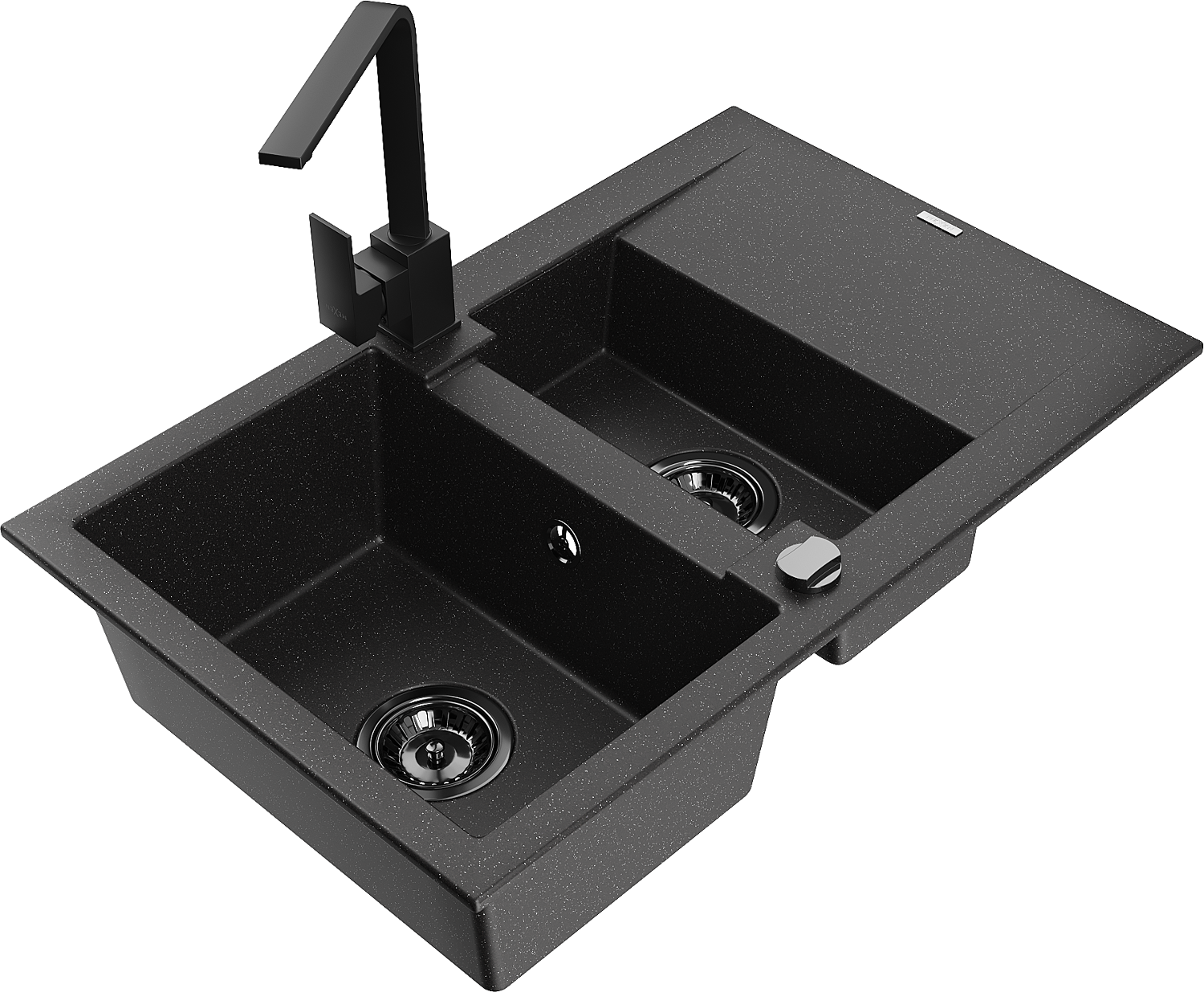 Mexen Gaspar žulový drez 1,5-komorový so sušičkou a kuchynskou batériou Rita, čierny/strieborný - 6507-73-670300-70-B
