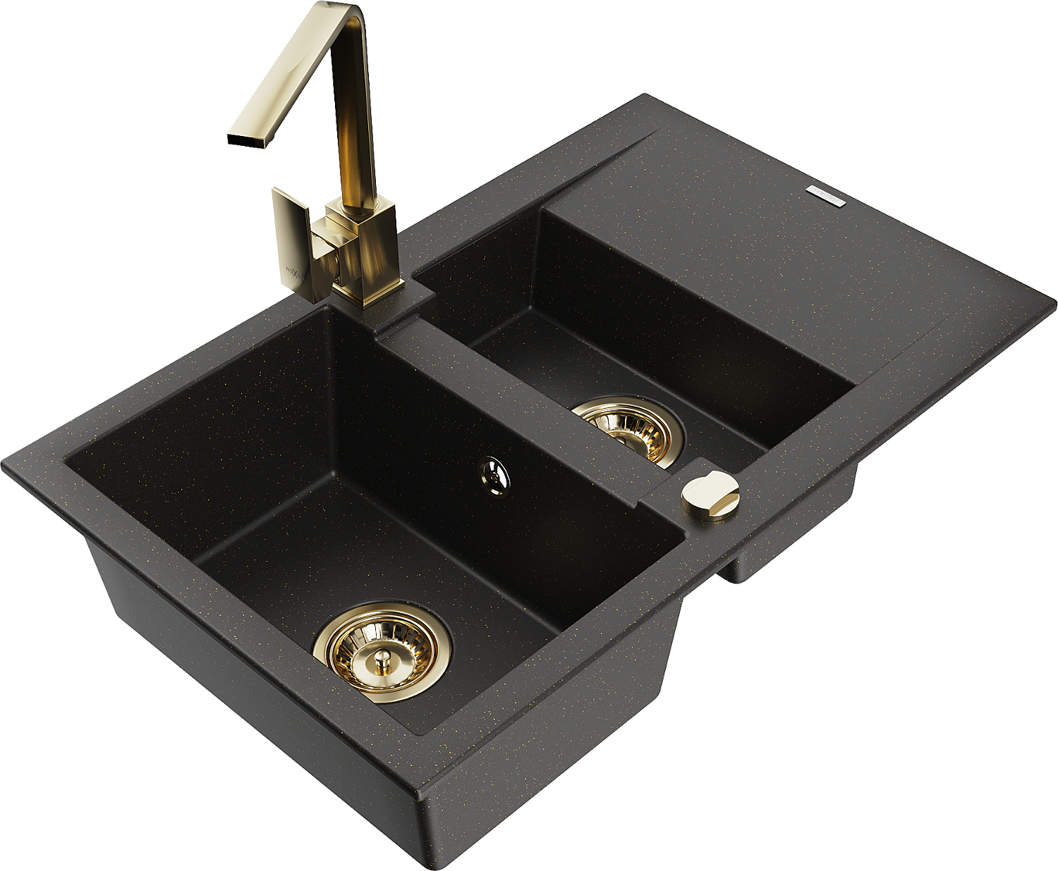 Mexen Gaspar žulový kuchynský drez 1,5-komorový s odkvapkávačom a kuchynskou batériou Rita, čierny/zlatý - 6507-75-670300-50