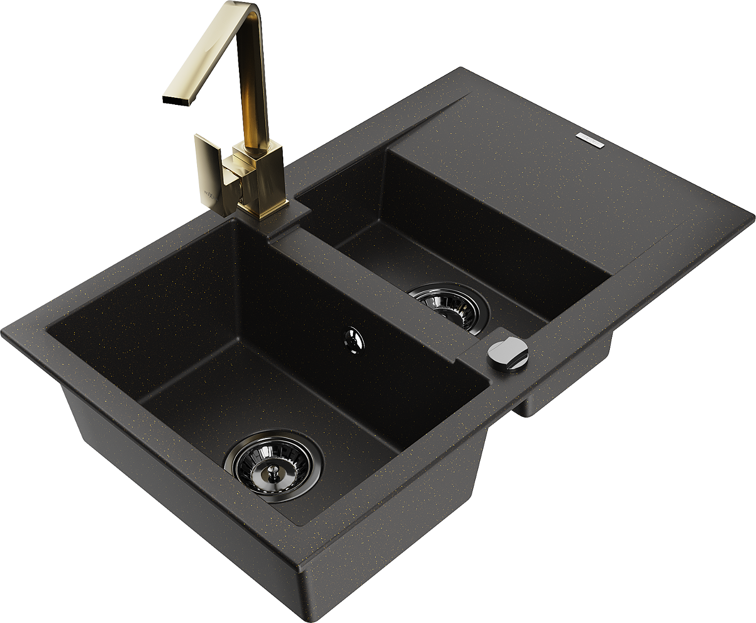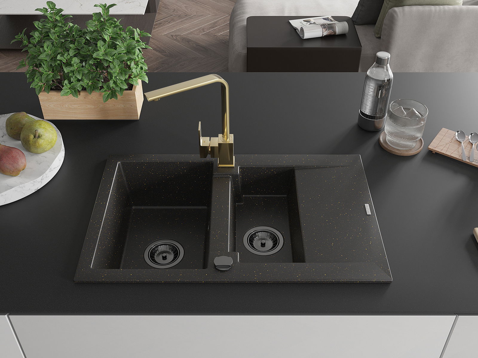 Mexen Gaspar žulový kuchynský drez 1,5-komorový s odkvapkávačom a kuchynskou batériou Rita, čierna/zlatá - 6507-75-670300-50-B