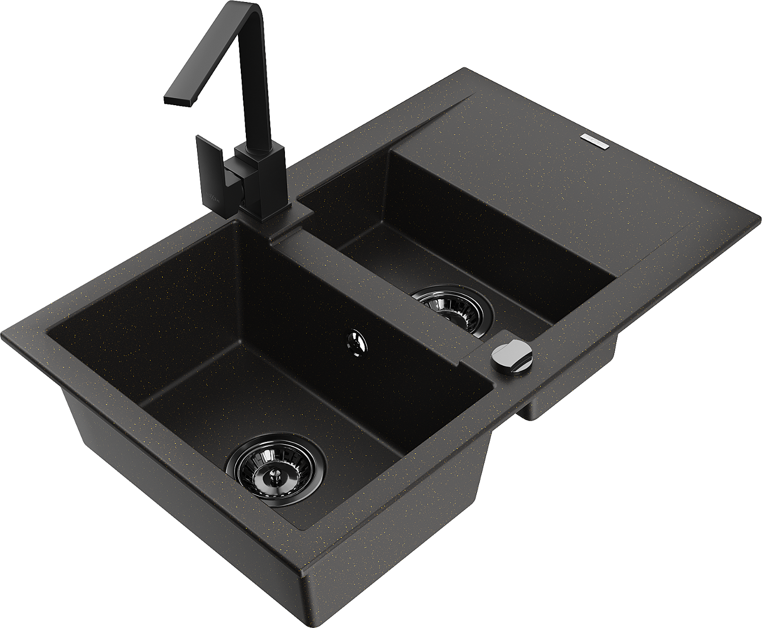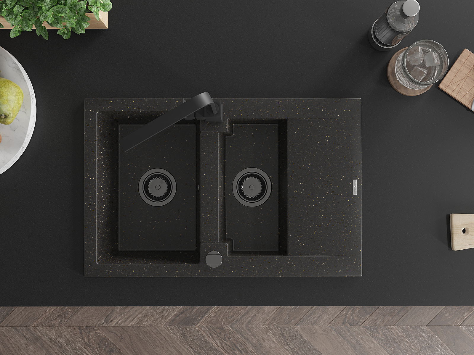 Mexen Gaspar Granitový drez 1,5-komorový s odkvapkávačom a kuchynskou batériou Rita, čierny/zlatý - 6507-75-670300-70-B