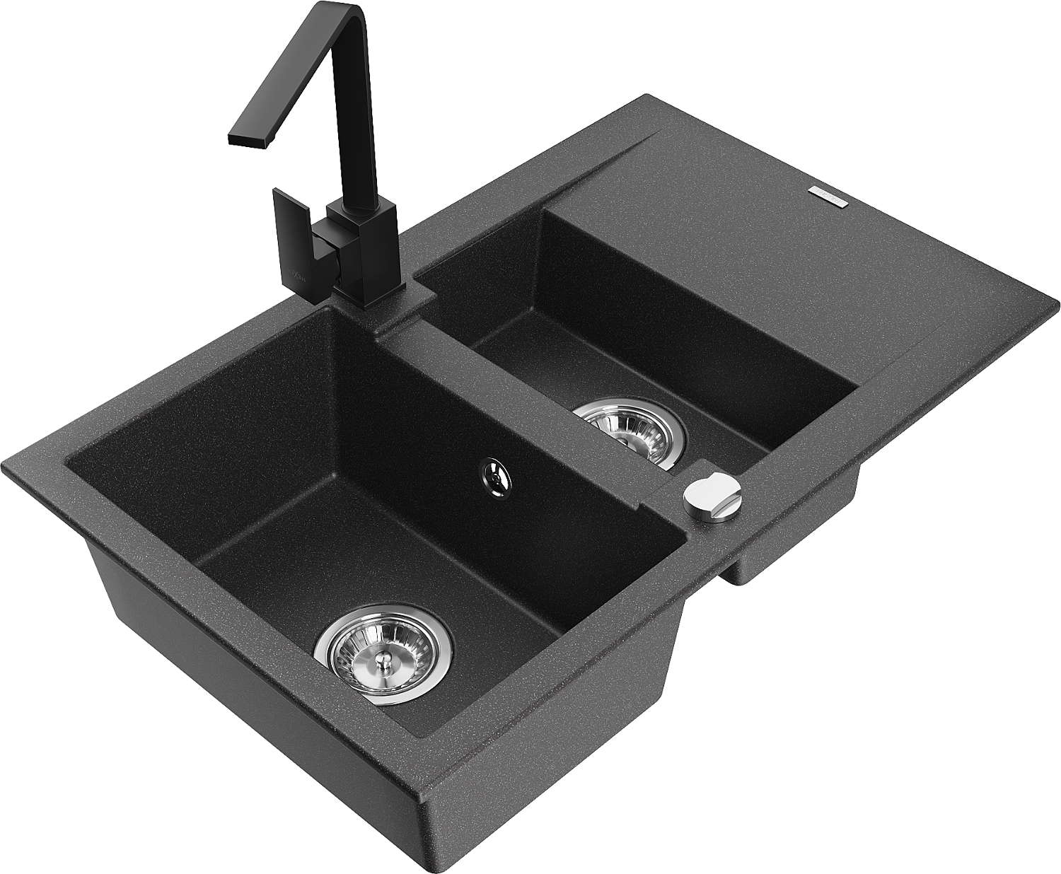 Mexen Gaspar žulový drez 1,5-komorový s odkvapkávačom a kuchynskou batériou Rita, čierny čapovaný - 6507-76-670300-70