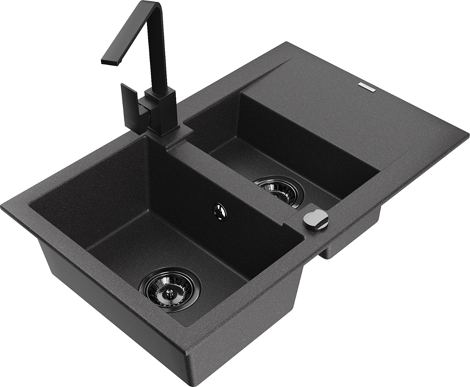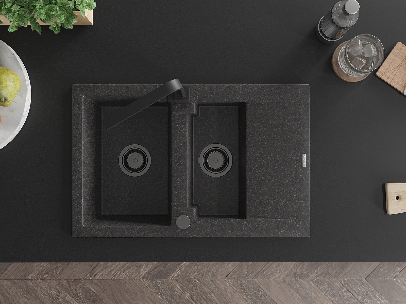 Mexen Gaspar granitový drez s 1,5 komorou s odkvapkávačom a kuchynskou batériou Rita, čierny s fŕkancami