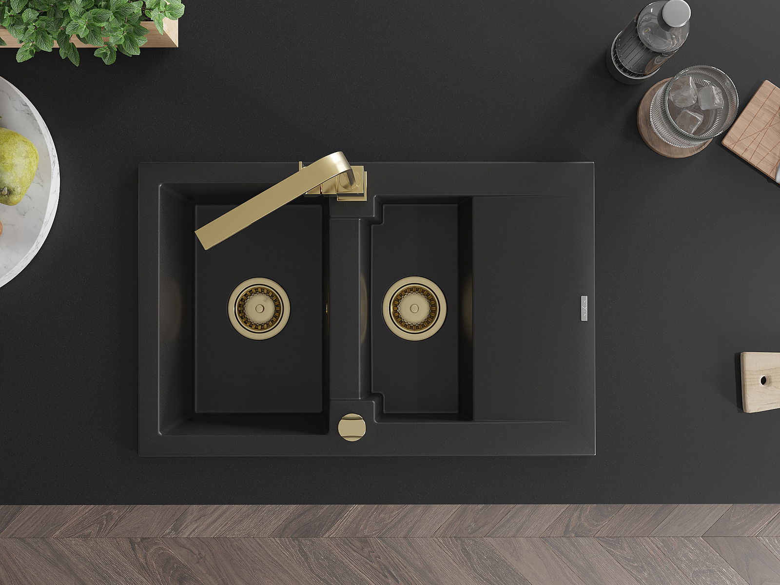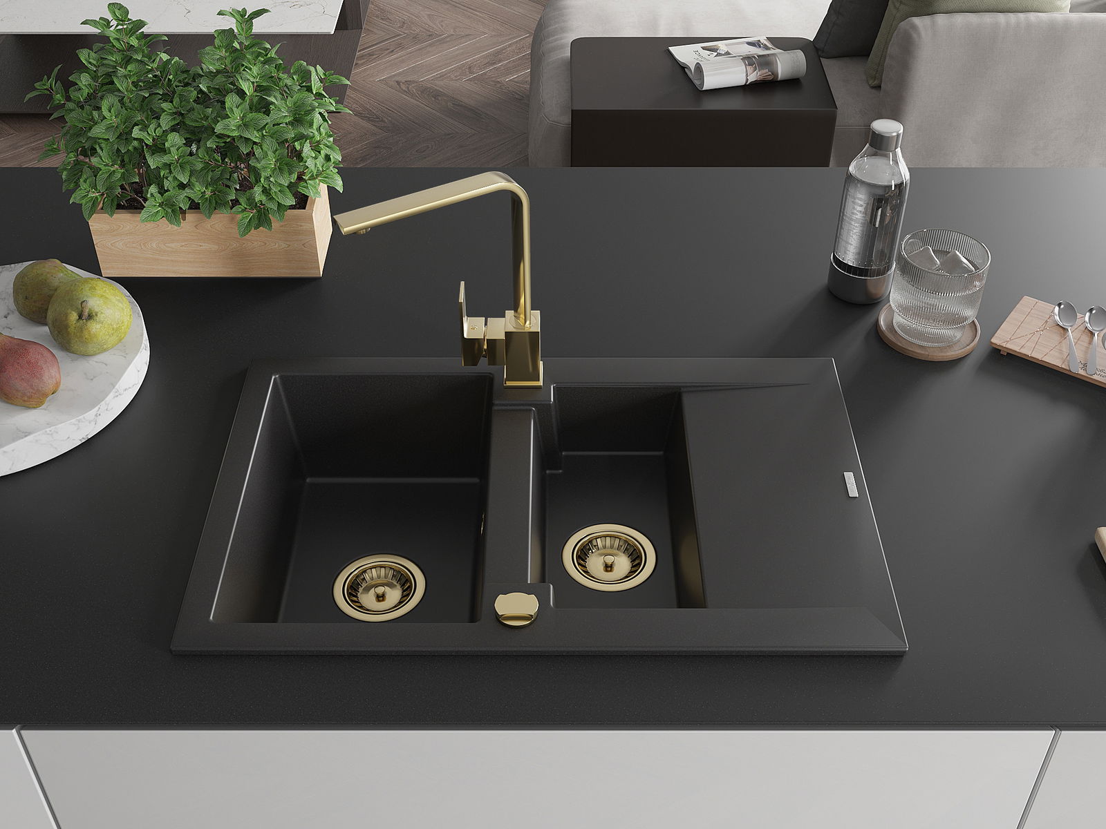 Mexen Gaspar granitový drez 1,5-komorový s odkvapkávačom a kuchynskou batériou Rita, čierny - 6507-77-670300-50