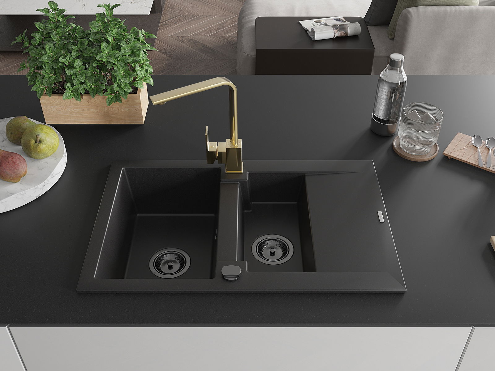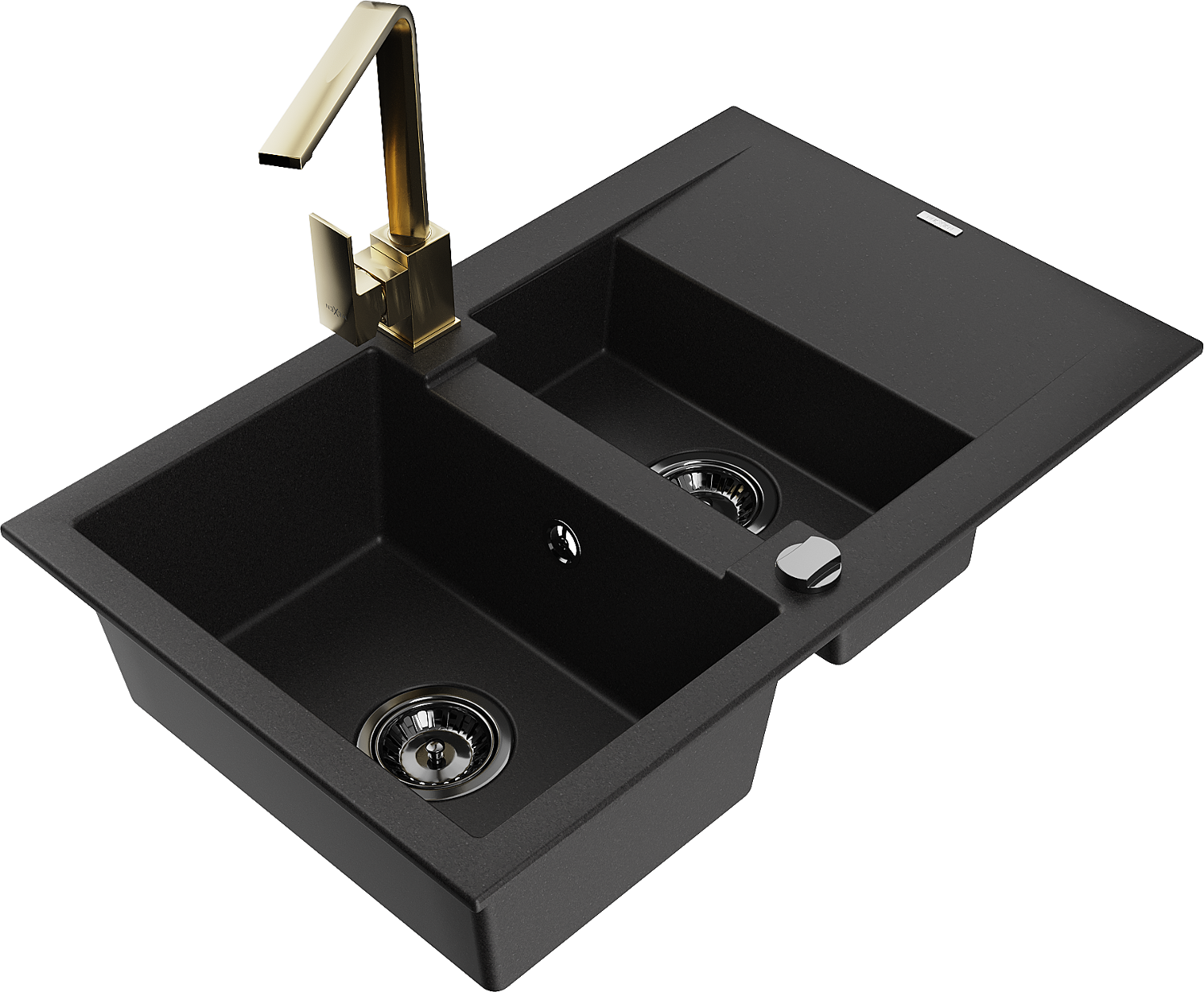 Mexen Gaspar žulový drez 1,5-komorový s odkvapkávačom a kuchynskou batériou Rita, čierny - 6507-77-670300-50-B