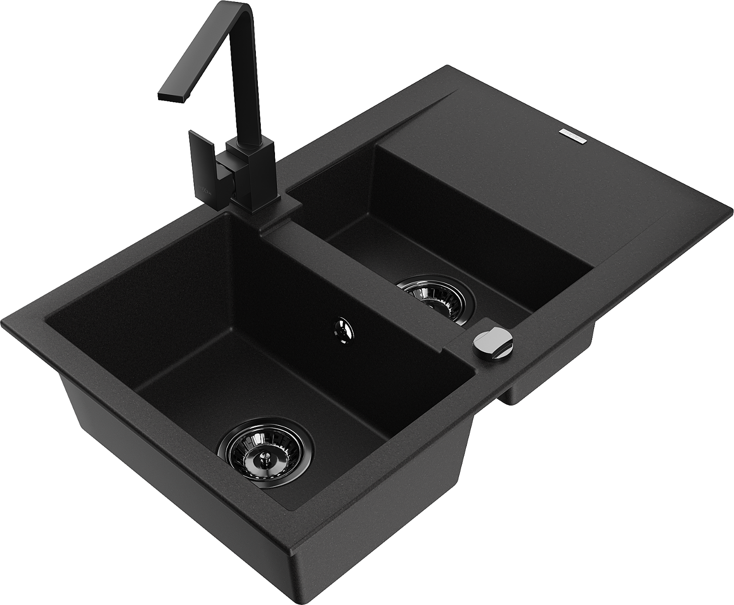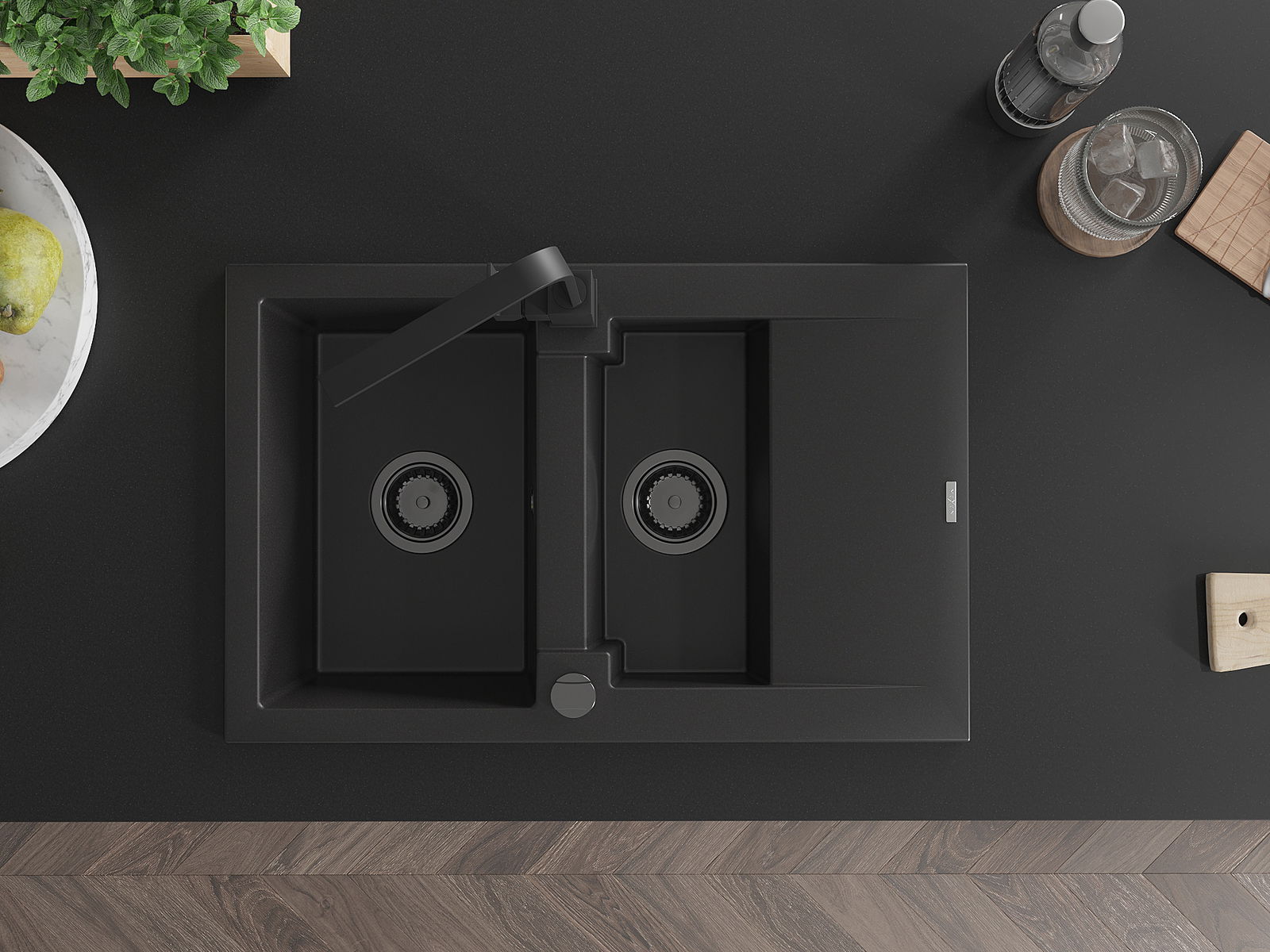 Mexen Gaspar žulový drez 1,5-komorový s odkvapkávačom a kuchynskou batériou Rita, čierny - 6507-77-670300-70-B