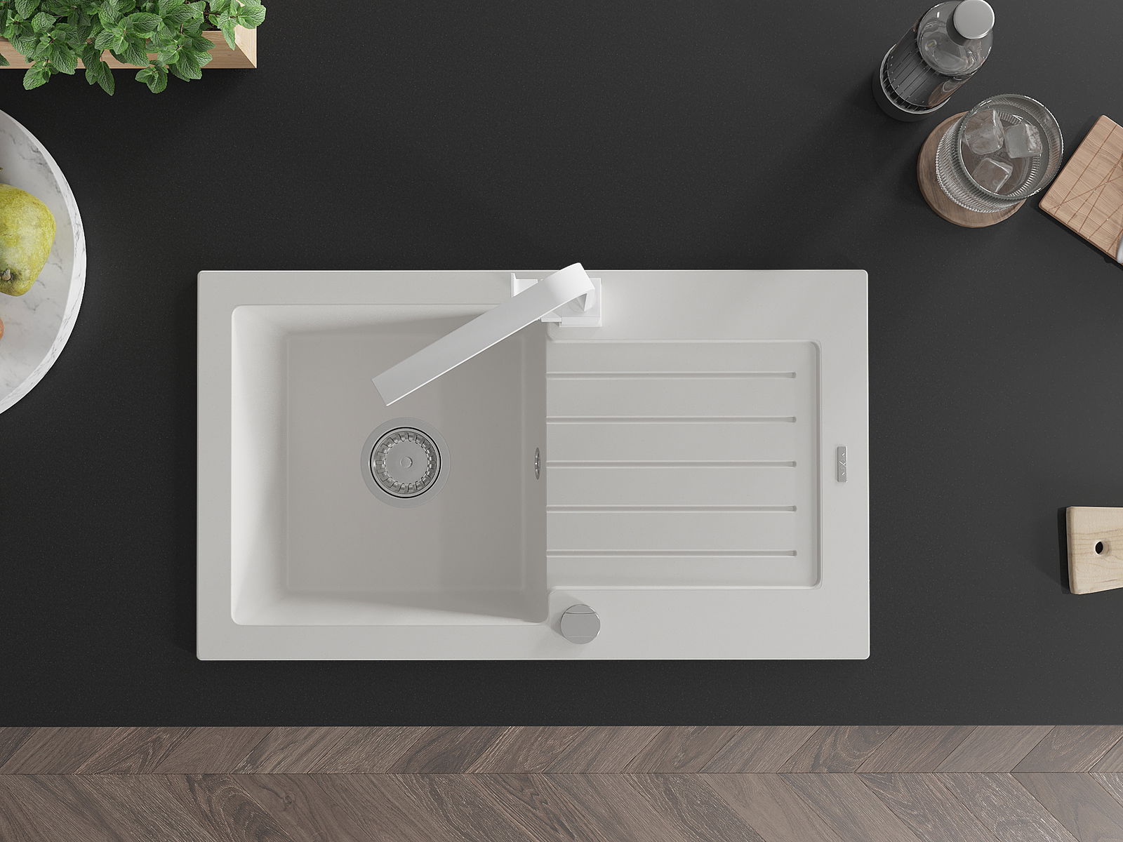 Povrch kuchynského drezu je odolný voči škvrnám a zafarbeniu, vďaka čomu sa ľahko udržiava a zachováva svoju farbu počas dlhého obdobia používania. Estetický a praktický doplnok pre každú kuchyňu.