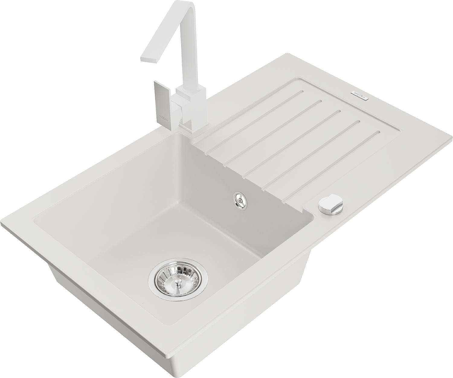 Mexen Pablo granitový drez 1-komorový s odkvapkávačom a kuchynskou batériou Rita, biely - 6510-20-670300-20
