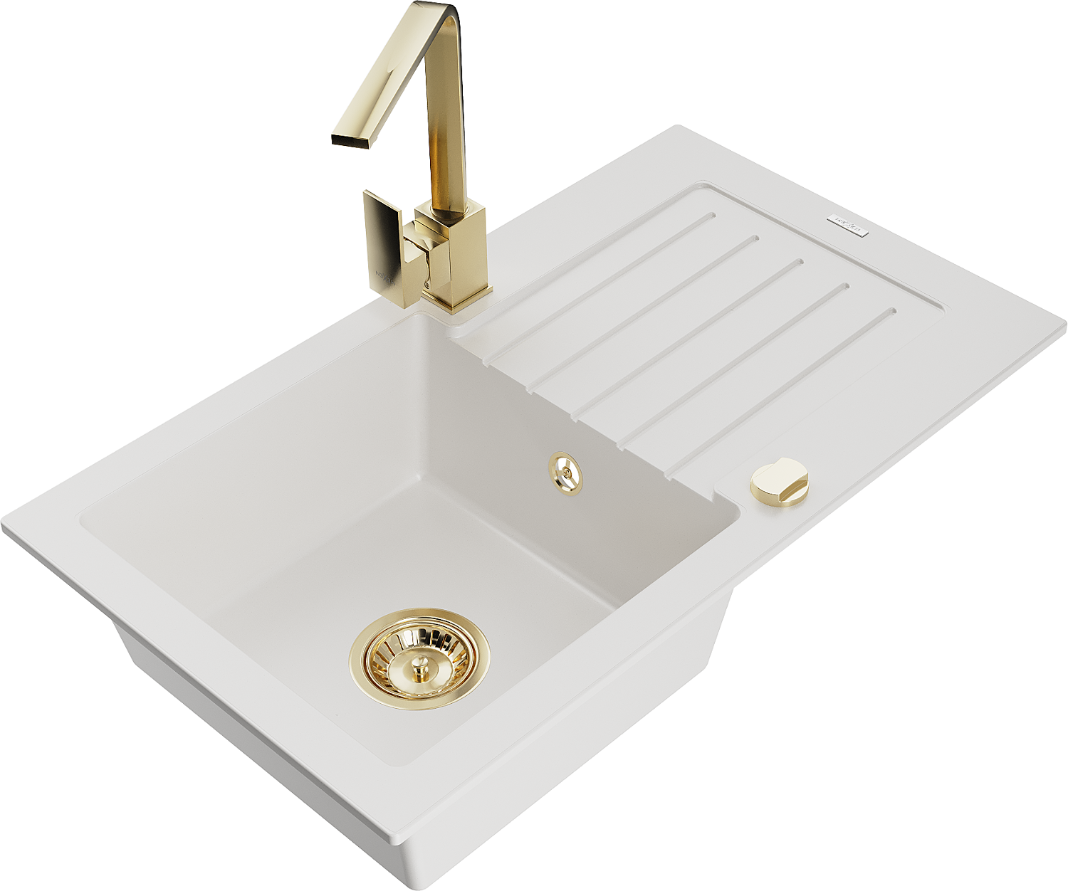 Mexen Pablo žulový drez s 1 komorou a odkvapkávačom a kuchynskou batériou Rita, biely - 6510-20-670300-50