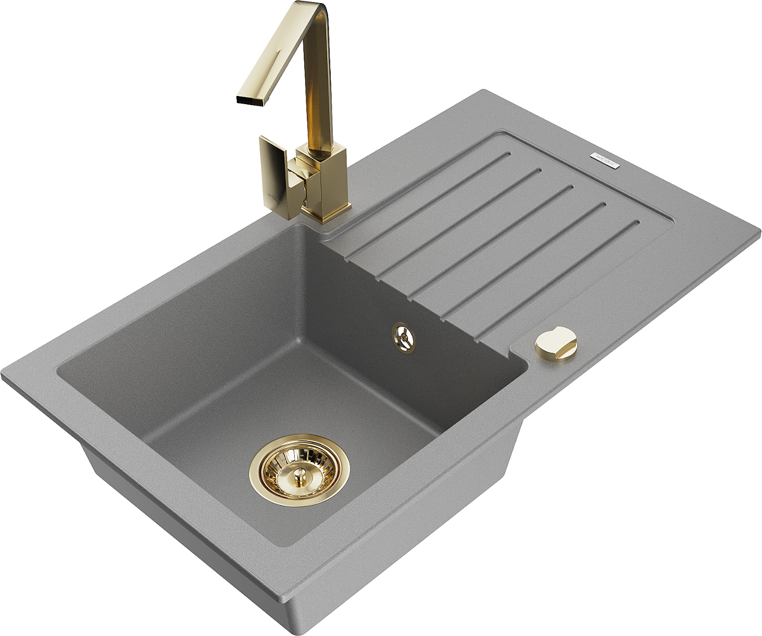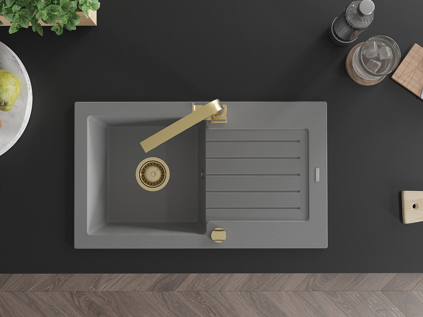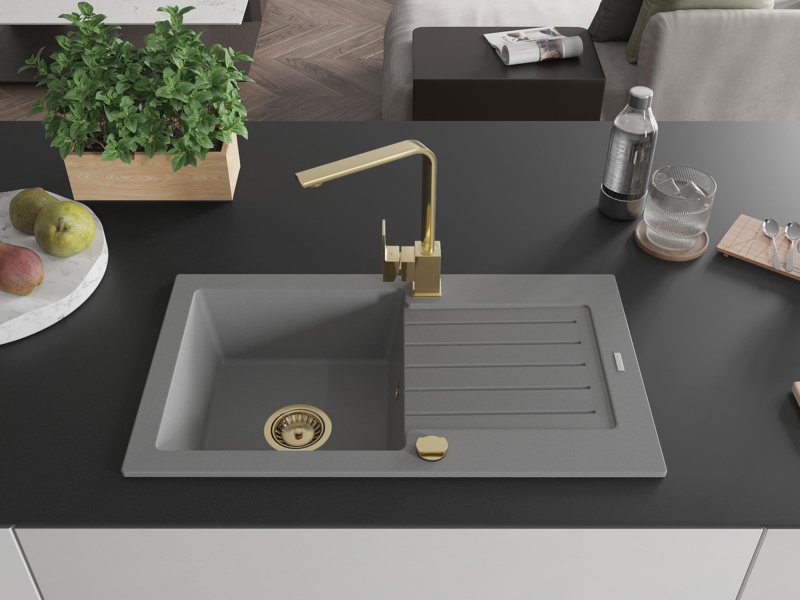Mexen Pablo jednokomorový kuchynský drez z granitu s odkvapkávačom a kuchynskou batériou Rita, sivý - 6510-71-670300-50